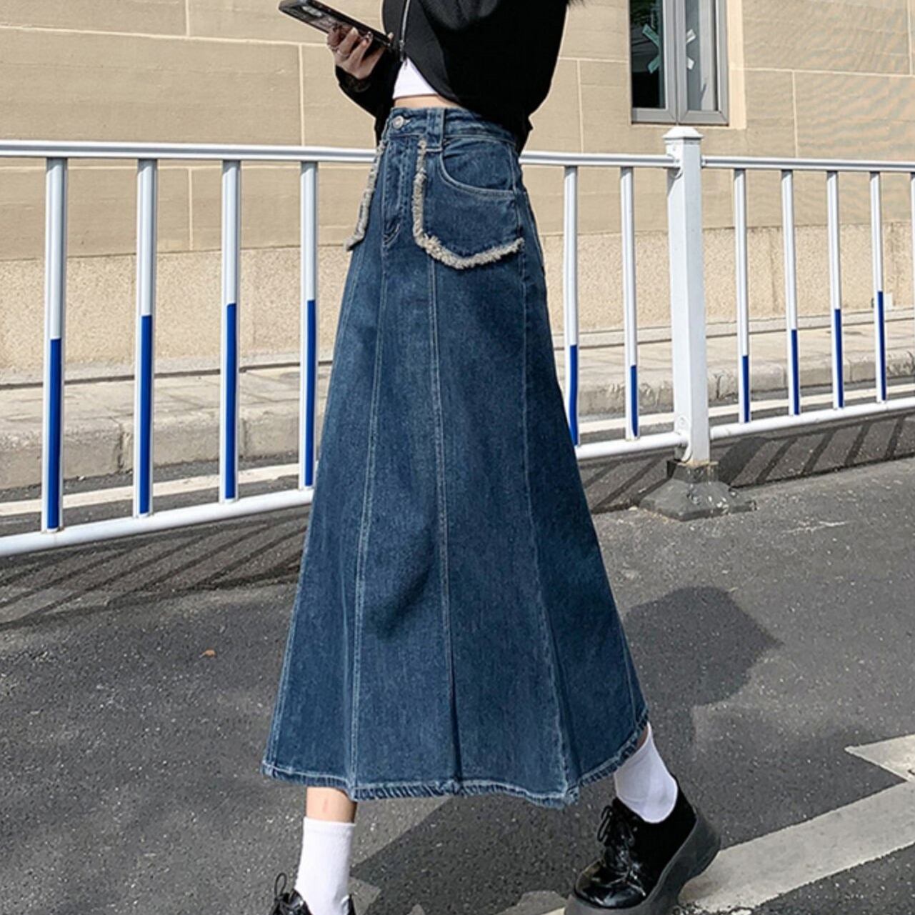 ボトムス スカート ミモレ丈スカート デニムスカート ハイウエスト Aライン ポケット 可愛い かわいい 大人可愛い きれいめ シンプル 上品 おしゃれ カジュアル レトロ こなれ感 個性的 主役級 存在感 抜け感 オールシーズン ベーシック ナチュラル クール メンズライク 無地 女性用 レディース ママ OL 通勤 学生 通学 デート お出かけ お泊まり 女子会 旅行 休日 カフェ ショッピング コンパ イベント 普段使い 脚長 S M L XL 2XL 3XL 4XL 5XL トレンド モテ | SPARKJOY レディースファッション
