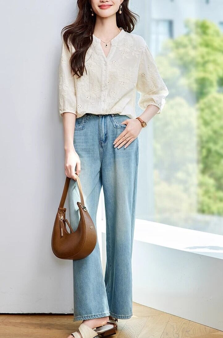 繊細なフラワー刺繍が華やかに映える、上品な七分袖ブラウス。