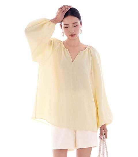 レディース トップス シャツ ブラウス プルオーバー ミモレ 長袖 ボリューム袖 ラウンドネック 襟なし ノーカラー フェミニン シフォン ふわふわ 透け感 異国風 薄手 シアー きれいめ シンプル カジュアル おしゃれ こなれ感 ラフ ルーズ ナチュラル 無地 春 夏 ロングシーズン 母の日 会議 MTG ミーティング ママ マタニティ オフィス 学校 デート お出かけ 旅行 女子会 休日 ショッピング お花見 カフェ 楽ちん 体型カバー 普段使い 着回し 流行 S M L XL ゆる イエロー | SPARKJOY レディースファッション
