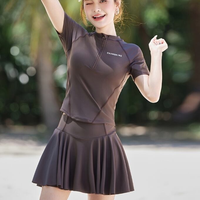 スイムウエア 水着 セパレート水着 半袖 ハイネック ハーフジップ ショート丈 スカート パッド付き 洋服みたい 伸縮性 可愛い かわいい 大人可愛い シンプル カジュアル 大人 おしゃれ お洒落 大人女子 こなれ感 個性的 クール メンズライク スポーティー 主役級 存在感 抜け感 夏 10代 20代 30代 女性用 レディース デート お出かけ 女子会 休日 イベント 旅行 リゾート バカンス 海 プール 温泉 美脚 脚長 M L XL 2XL 3XL トレンド モテ 体型カバー 二の腕カバー | SPARKJOY レディースファッション