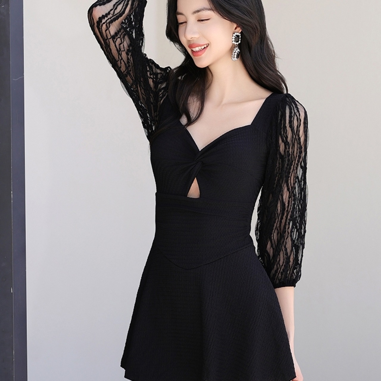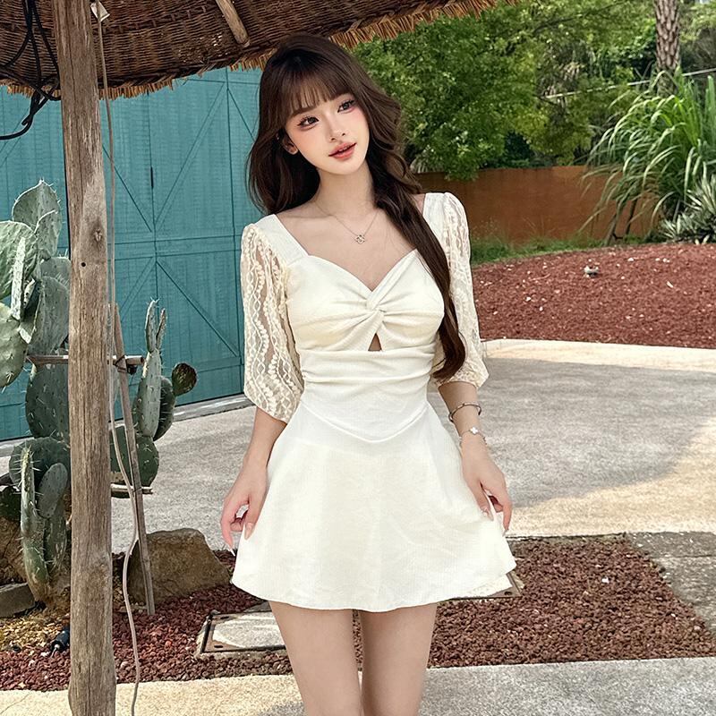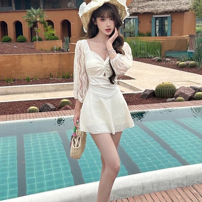 スイムウエア 水着 ワンピース水着 7分袖 クロスデザイン スカート 胸元 刺繡 パッド付き 透かし編み 伸縮性 可愛い かわいい 大人可愛い シンプル カジュアル 大人 おしゃれ お洒落 大人女子 こなれ感 個性的 キュート フェミニン ガーリー 主役級 存在感 抜け感 夏 10代 20代 30代 女性用 レディース デート お出かけ 女子会 休日 イベント 旅行 リゾート バカンス 海 プール 温泉 美脚 脚長 M L XL 2XL 3XL 4XL トレンド モテ 体型カバー 二の腕カバー | SPARKJOY レディースファッション