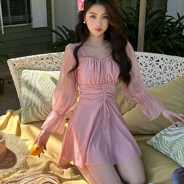 スイムウエア 水着 ワンピース水着 長袖 ボリューム袖 胸元 レース シャーリング シースルー スカート パッド付き 伸縮性 可愛い かわいい 大人可愛い シンプル カジュアル 大人 おしゃれ お洒落 大人女子 こなれ感 個性的 キュート フェミニン ガーリー 清楚 無地 主役級 存在感 抜け感 夏 10代 20代 女性用 レディース デート お出かけ 女子会 休日 イベント 旅行 リゾート バカンス 海 プール 温泉 美脚 脚長 M L XL 2XL 3XL トレンド モテ 日焼け防止 二の腕カバー | SPARKJOY レディースファッション
