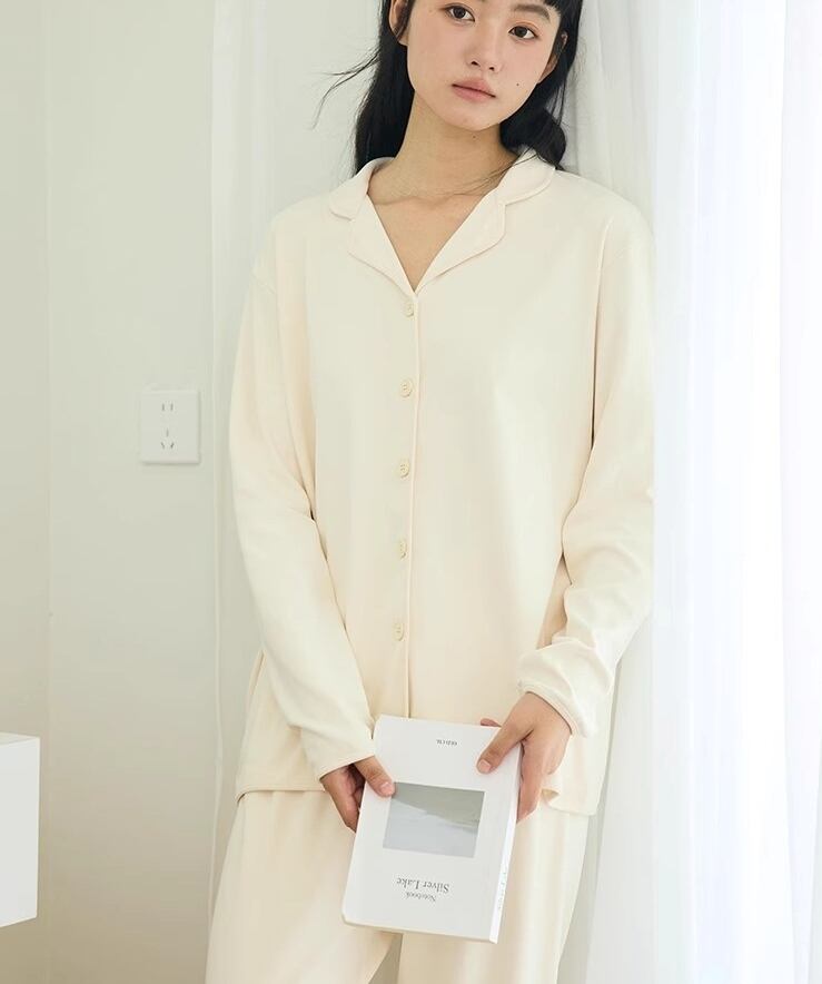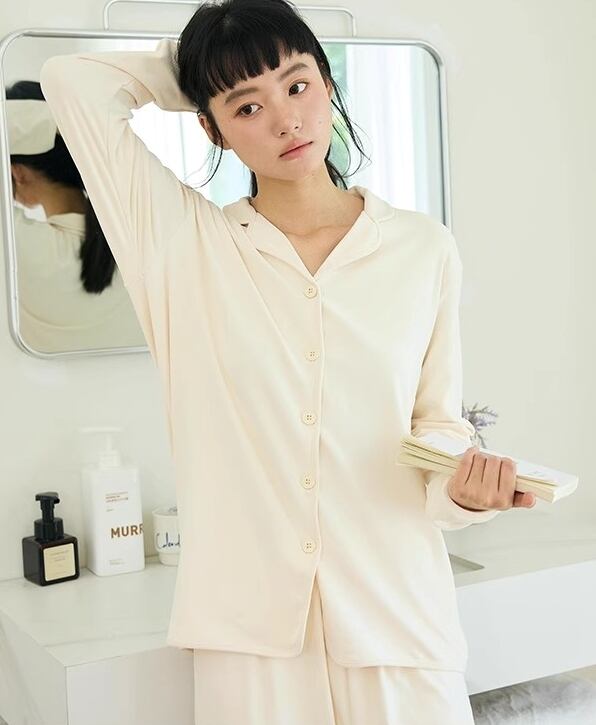 パジャマ ナイトウエア 上下セット パジャマ 長袖 襟付き 前開き ボタン ミディアム丈 ロングパンツ ウエストゴム 可愛い かわいい 大人可愛い きれいめ シンプル 上品 おしゃれ かっこいい レトロ ルーズ こなれ感 個性的 主役級 存在感 抜け感 オールシーズン ロングシーズン ナチュラル ベーシック キュート 無地レディース 女性用 ママ デート お出かけ お泊まり イベント 女子会 休日 ホテル お泊まりデート 旅行 普段使い 着回し M L 定番アイテム モテ 楽ちん カラーバリエーション | SPARKJOY レディースファッション