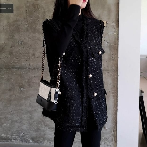 シンプルで上品なデザインのこのベストは、ミディアム丈のツイード素材が特徴です。