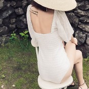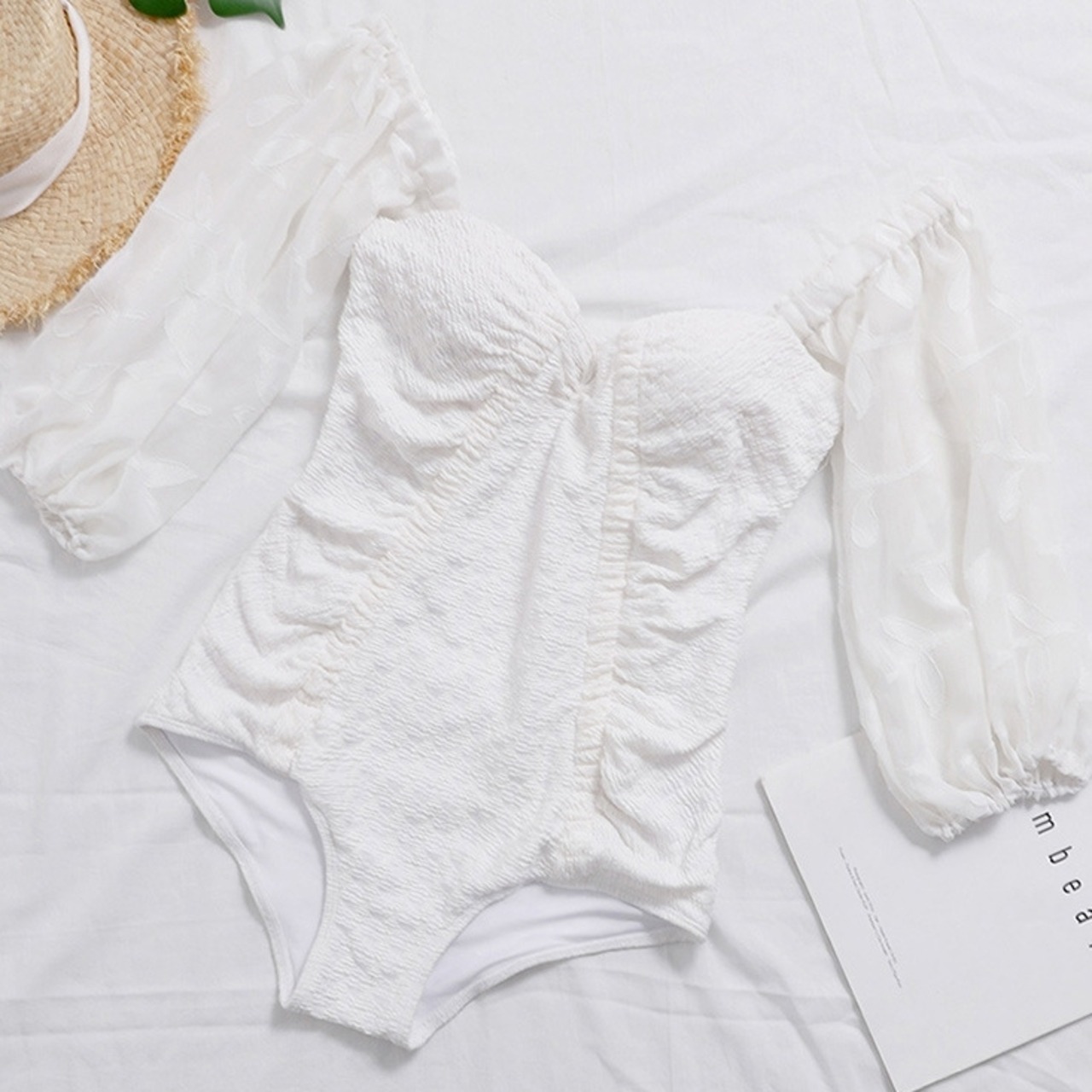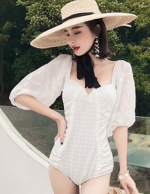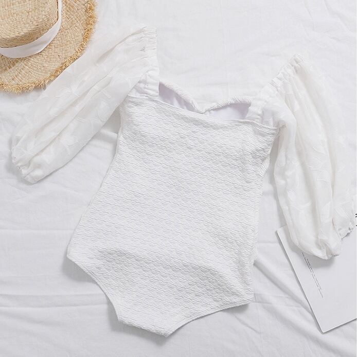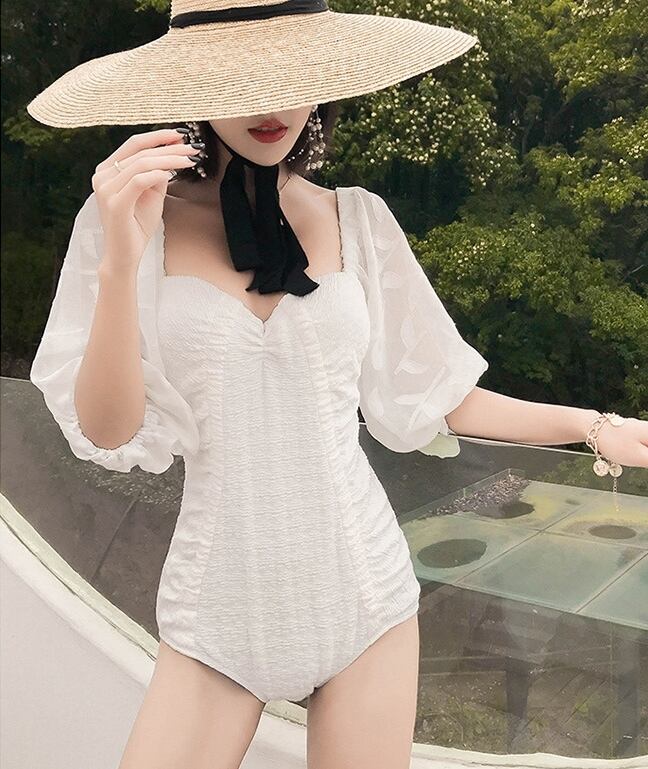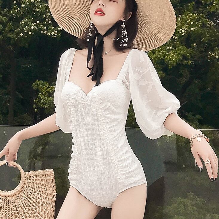 スイムウエア 水着 ワンピース水着 5分袖 ボリューム袖 胸元 ハートネック 背中開き バックシャン シースルー 洋服みたい 伸縮性 可愛い かわいい 大人可愛い シンプル カジュアル 大人 おしゃれ お洒落 大人女子 こなれ感 個性的 キュート エレガント ガーリー フェミニン 無地 主役級 存在感 抜け感 夏 10代 20代 女性用 レディース デート お出かけ 女子会 休日 イベント 旅行 リゾート バカンス 海 プール 温泉 美脚 脚長 M L XL トレンド 日焼け防止 二の腕カバー | SPARKJOY レディースファッション