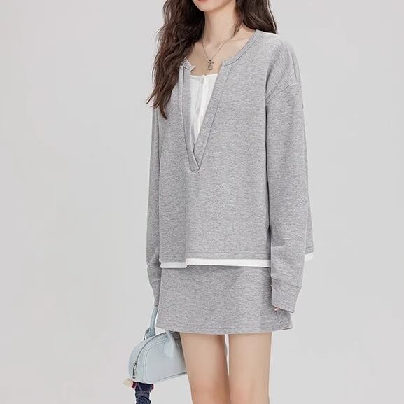 2点セット セットアップ スウェット 長袖 重ね着風 プルオーバー ミディアム丈 ミニスカート Aライン ウエストゴム ポケット 可愛い かわいい 大人可愛い きれいめ シンプル 上品 レトロ おしゃれ かっこいい カジュアル こなれ感 個性的 主役級 存在感 抜け感 秋 冬 ベーシック ナチュラル キュート スポーティー 無地 女性用 レディース ママ OL 通勤 学生 通学 デート お出かけ お泊まり 女子会 旅行 休日 カフェ ショッピング コンパ イベント 普段使い 着回し 重ね着 ワンサイズ | SPARKJOY レディースファッション
