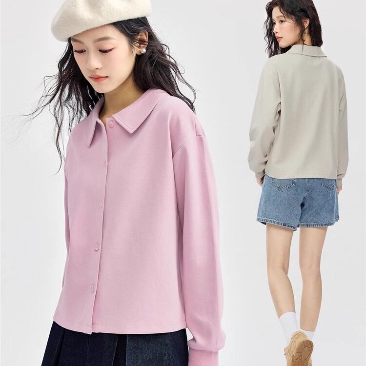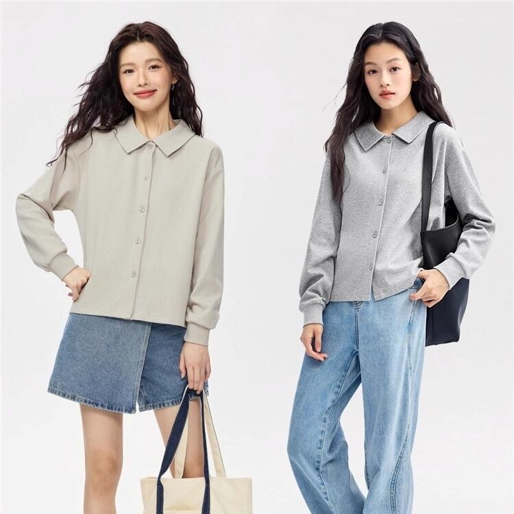 襟付きのデザインと前開きボタン付きで、シンプルながらも存在感を放ちます。
