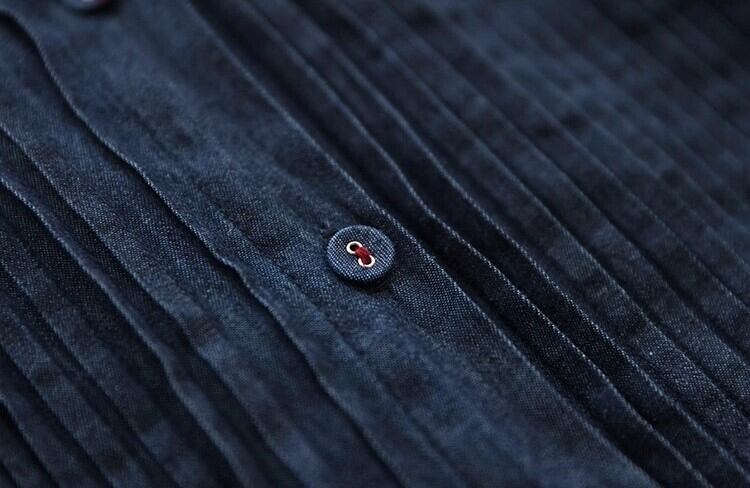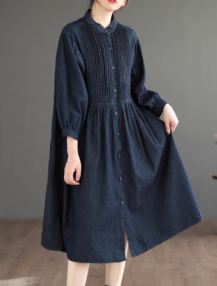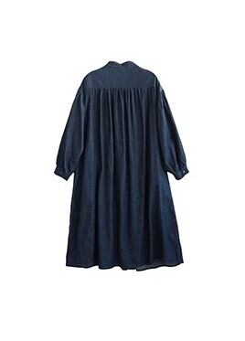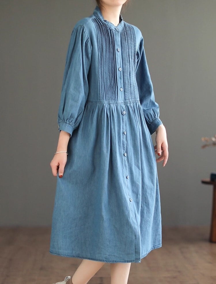 柔らかなデニム調の素材が魅力のワンピース。胸元のピンタックデザインが上品さを演出し、ナチュラルな可愛らしさと大人の落ち着きを両立しています。