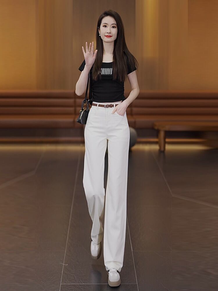ハイウエストデザインとフルレングスのシルエットが特徴で、きれいめなスタイルを演出します。