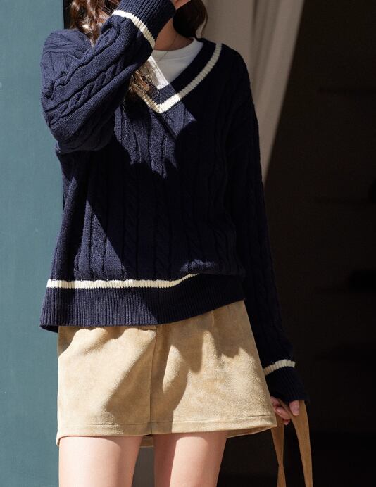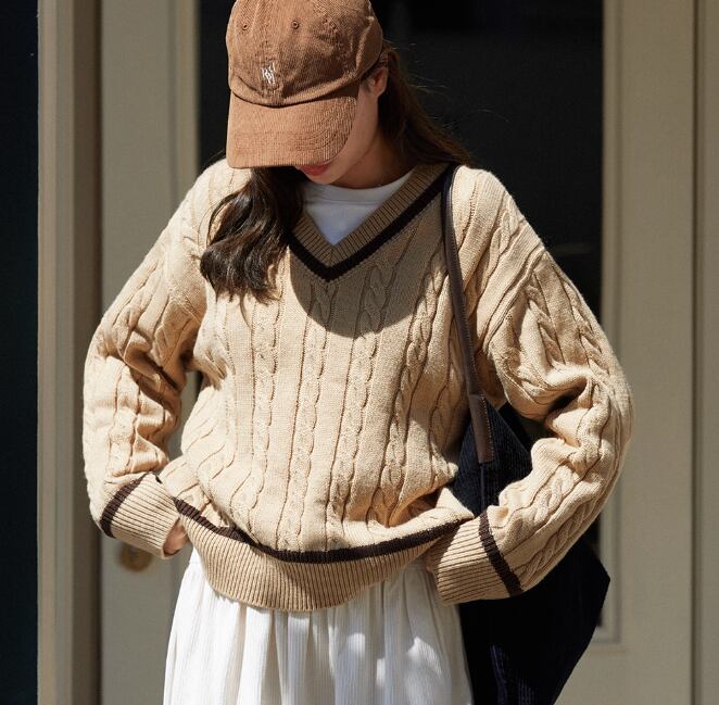 Vネックデザインの洗練された一着です。ヴィンテージ感が漂う可愛らしさと大人の上品さを兼ね備えたアイテムで、シンプルでありながらおしゃれな印象を与えます。カジュアルからきれいめまで幅広く活躍するこのセーターは、さまざまなスタイルに合わせやすく、デイリーコーデにもおススメです!