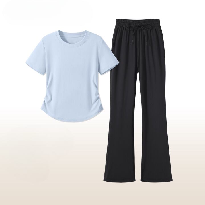 半袖のプルオーバーとロングパンツの組み合わせが、リラックスしながらもおしゃれな印象を与えます。