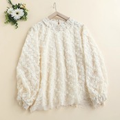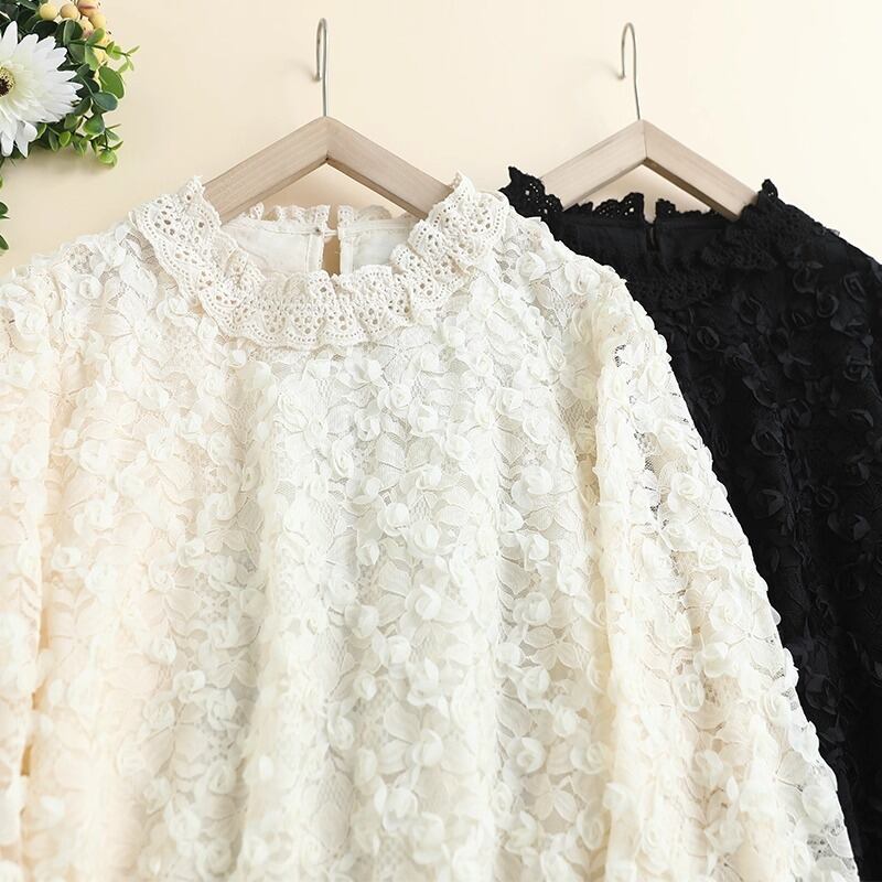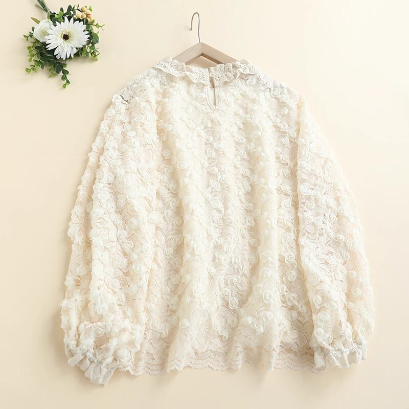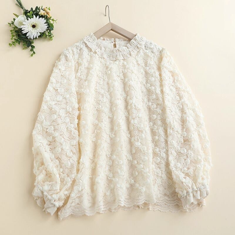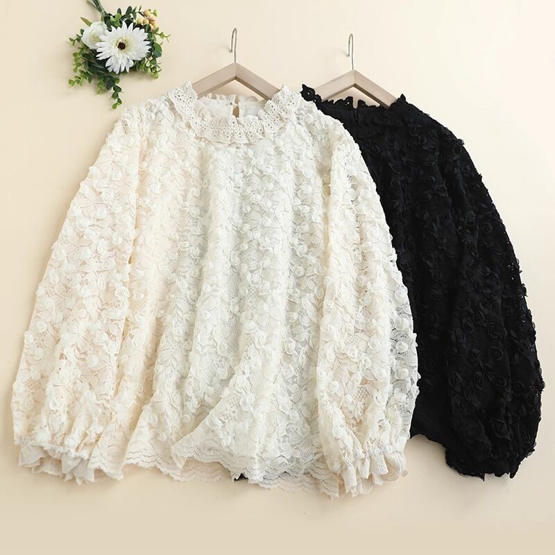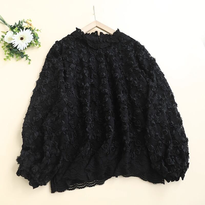 繊細なレースの花柄が華やかさを引き立てる、フェミニンなレースブラウスです。立体感のあるフラワーモチーフが全体にあしらわれ、上品でありながら柔らかな印象を与えます。