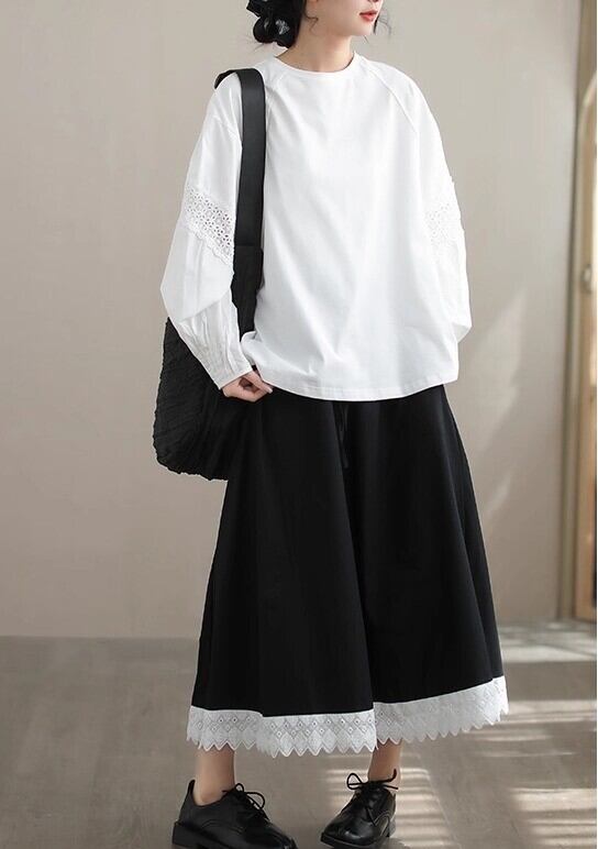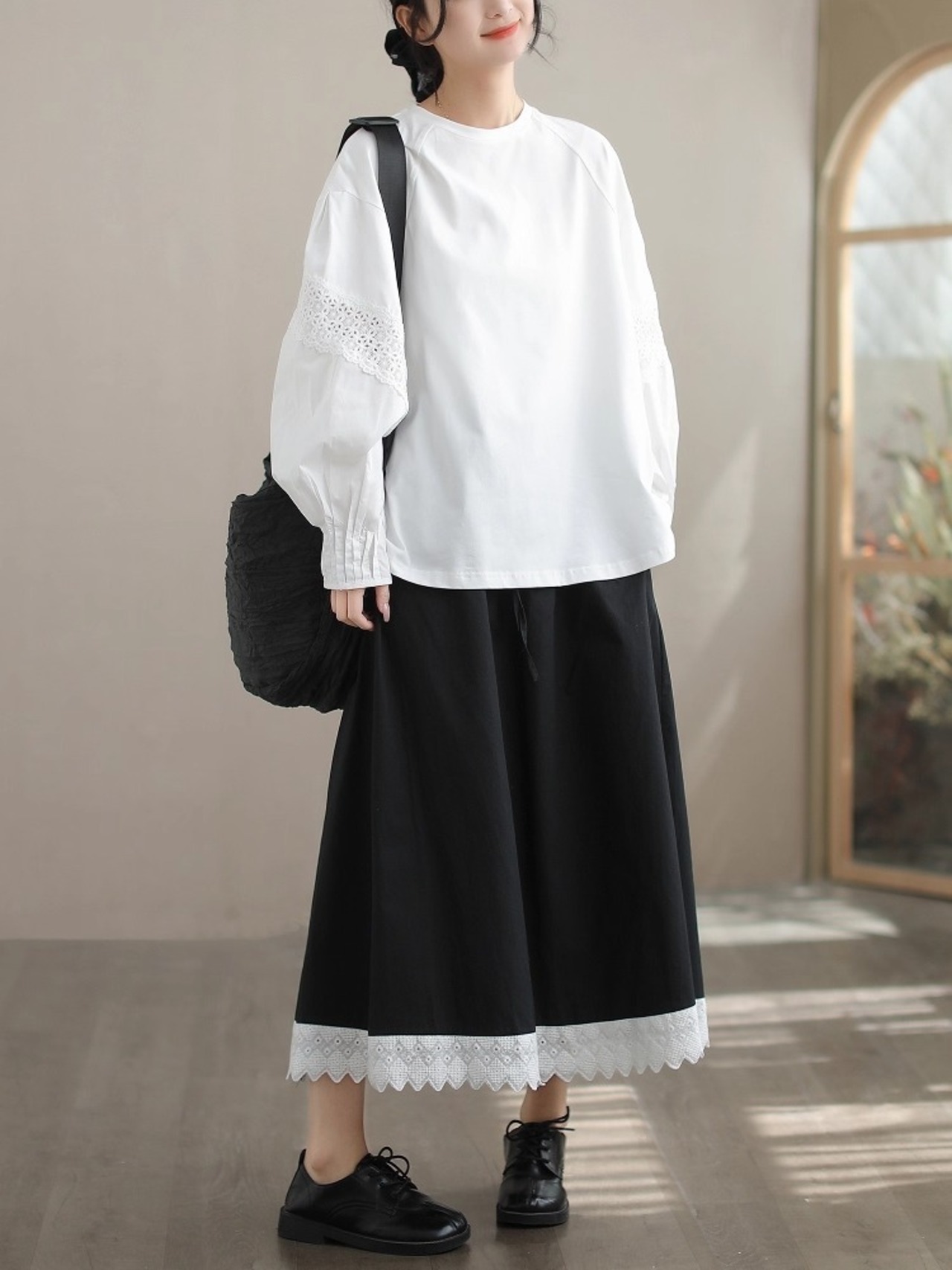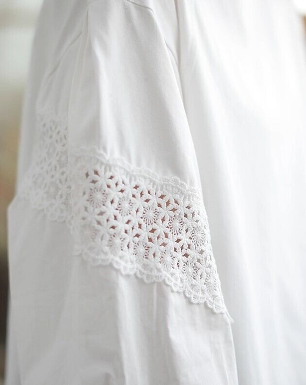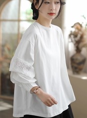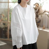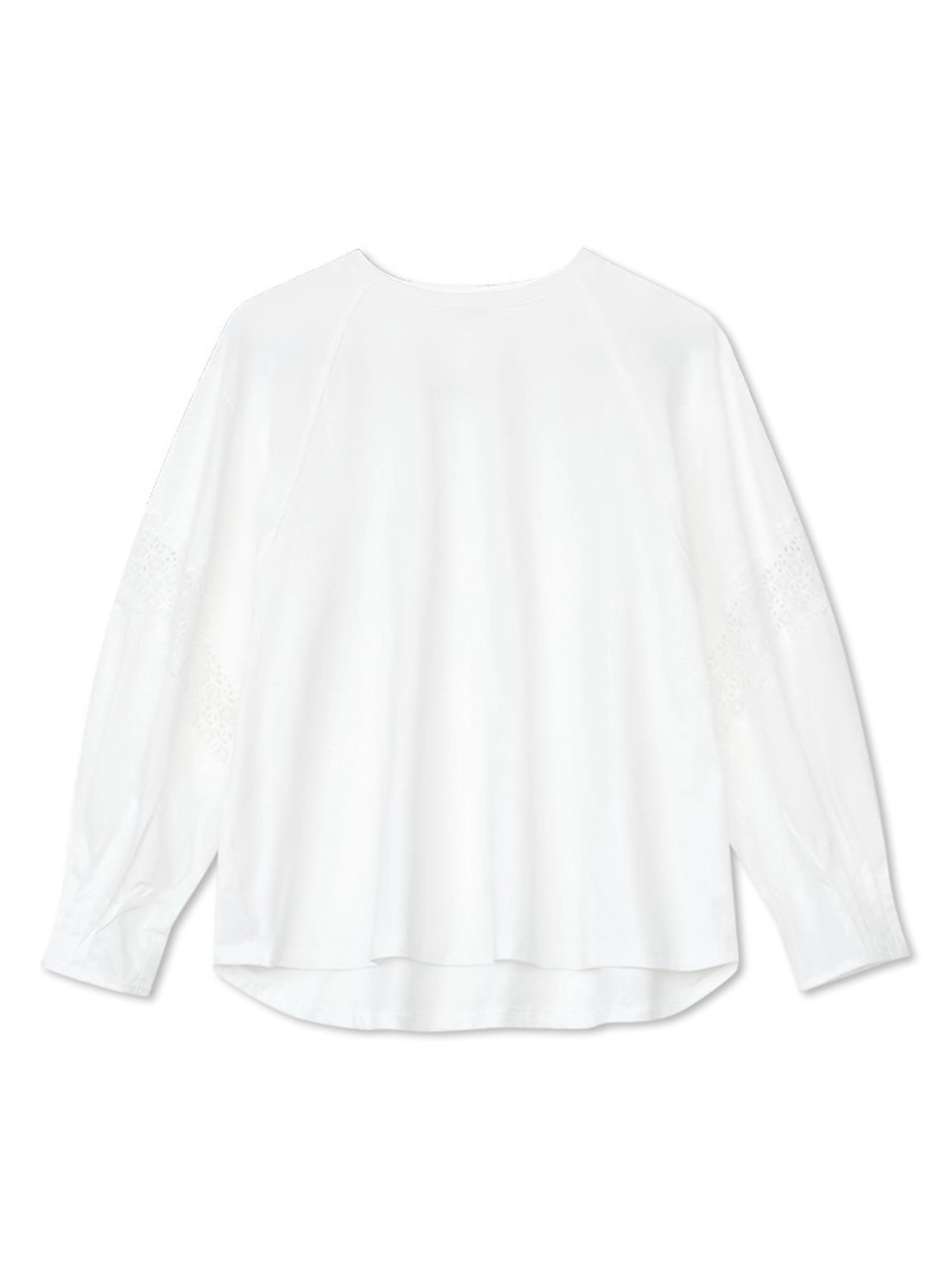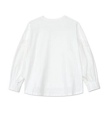 清潔感のあるホワイトに、袖口のレース切り替えがアクセントになった長袖Tシャツです。シンプルなデザインの中にさりげないフェミニンさを取り入れ、大人可愛いスタイルを演出します。