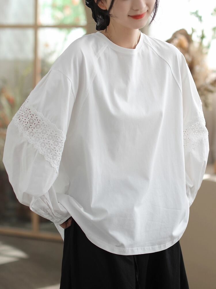 レディース トップス ロンT プルオーバー Tシャツ 長袖 ボリューム袖 ドロップショルダー クルーネック 襟なし ノーカラー 切り替え タック レース 透け感 切り替えデザイン 大人可愛い シンプル カジュアル 上品 おしゃれ こなれ感 抜け感 ナチュラル 春 秋 ママ お出かけ アウトドア 旅行 公園 女子会 休日 ショッピング ライブ お花見 コンパ カフェ フェス コーデ 体型カバー 普段使い 着回し 大きいサイズ ゆったり 白 ホワイト | SPARKJOY レディースファッション