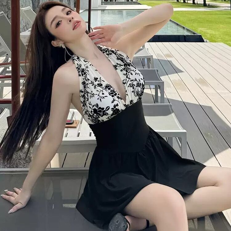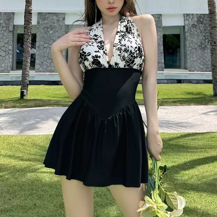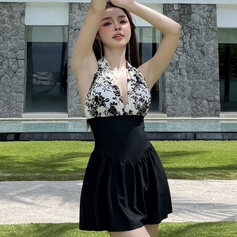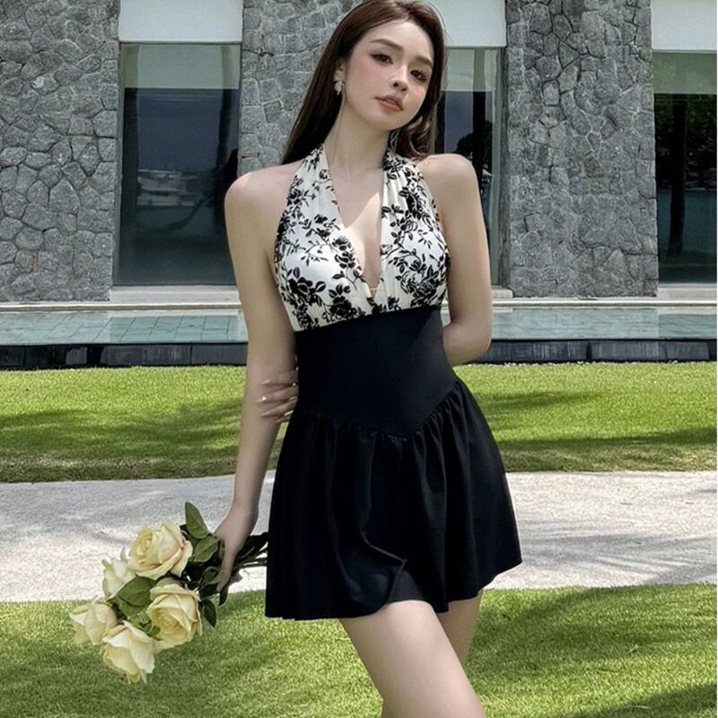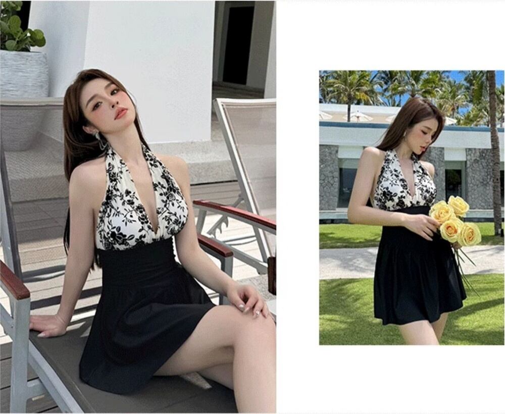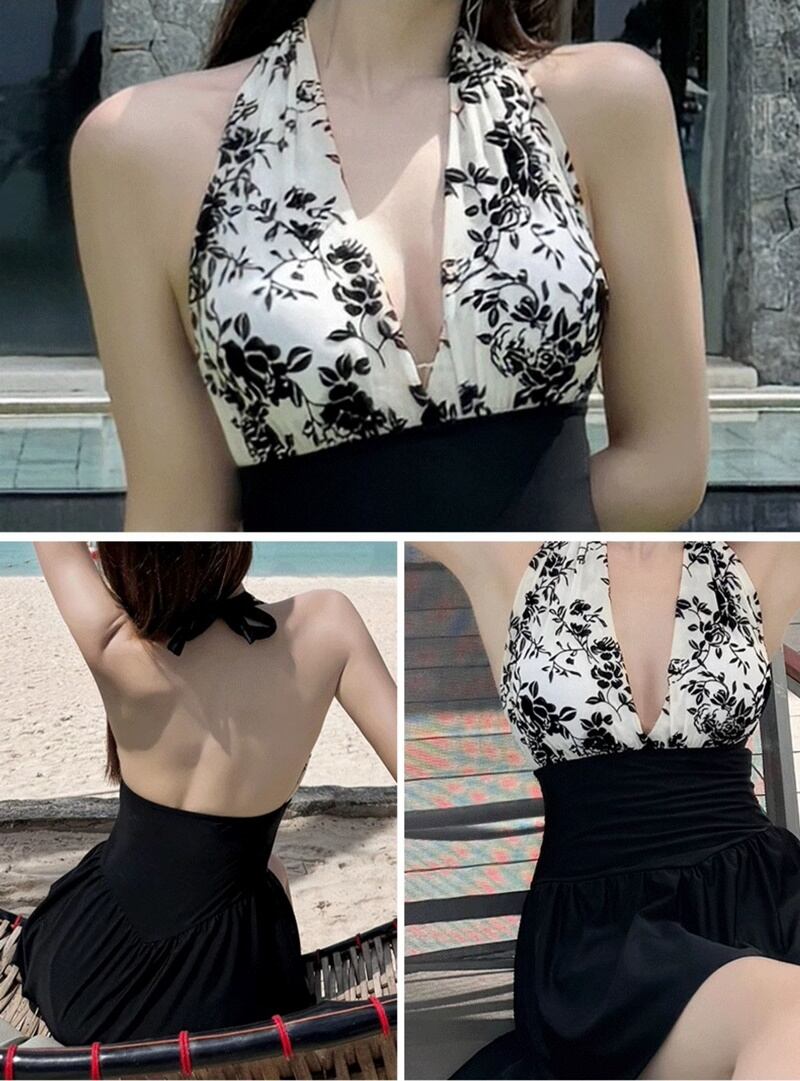 ワンピース水着 セクシー スカート ホルターネック スリム バイカラー 花柄 水着 スイムウェア レディース かわいい 大人可愛い きれいめ ナチュラル ゴージャス 華やか 大人っぽい おしゃれ お洒落 レトロ 主役級 存在感 キュート 個性的 クール モード系 スタイリッシュ かっこいい トレンド ヘルシー リゾート 旅行 温泉 プール 夏 海 美脚 脚長 着痩せ スタイルアップ 韓国 高見え 格上げ モテ 背中見せ 体型カバー インスタ映え スタイルカバー こなれ感 M L XL 2XL ブラック | SPARKJOY レディースファッション