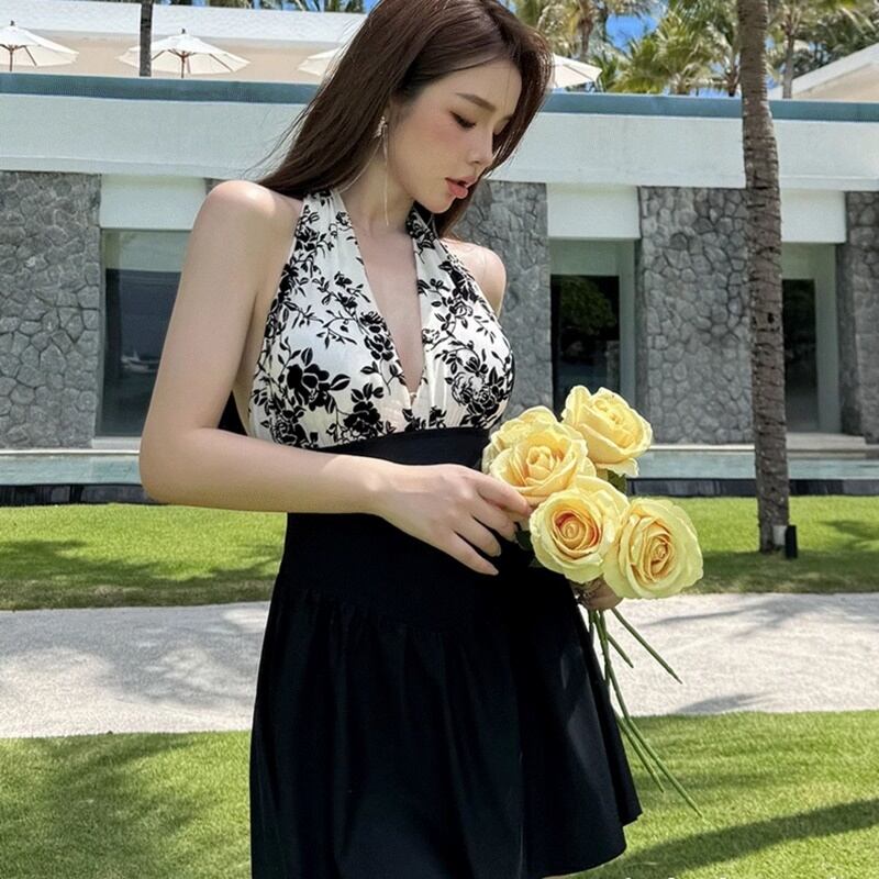 ホルターネックデザインが首元を美しく引き立て、スリムなシルエットがスタイルアップを実現します。バイカラーに花柄が施されたデザインは、リゾートやプールサイドで主役級の存在感を放ちます。