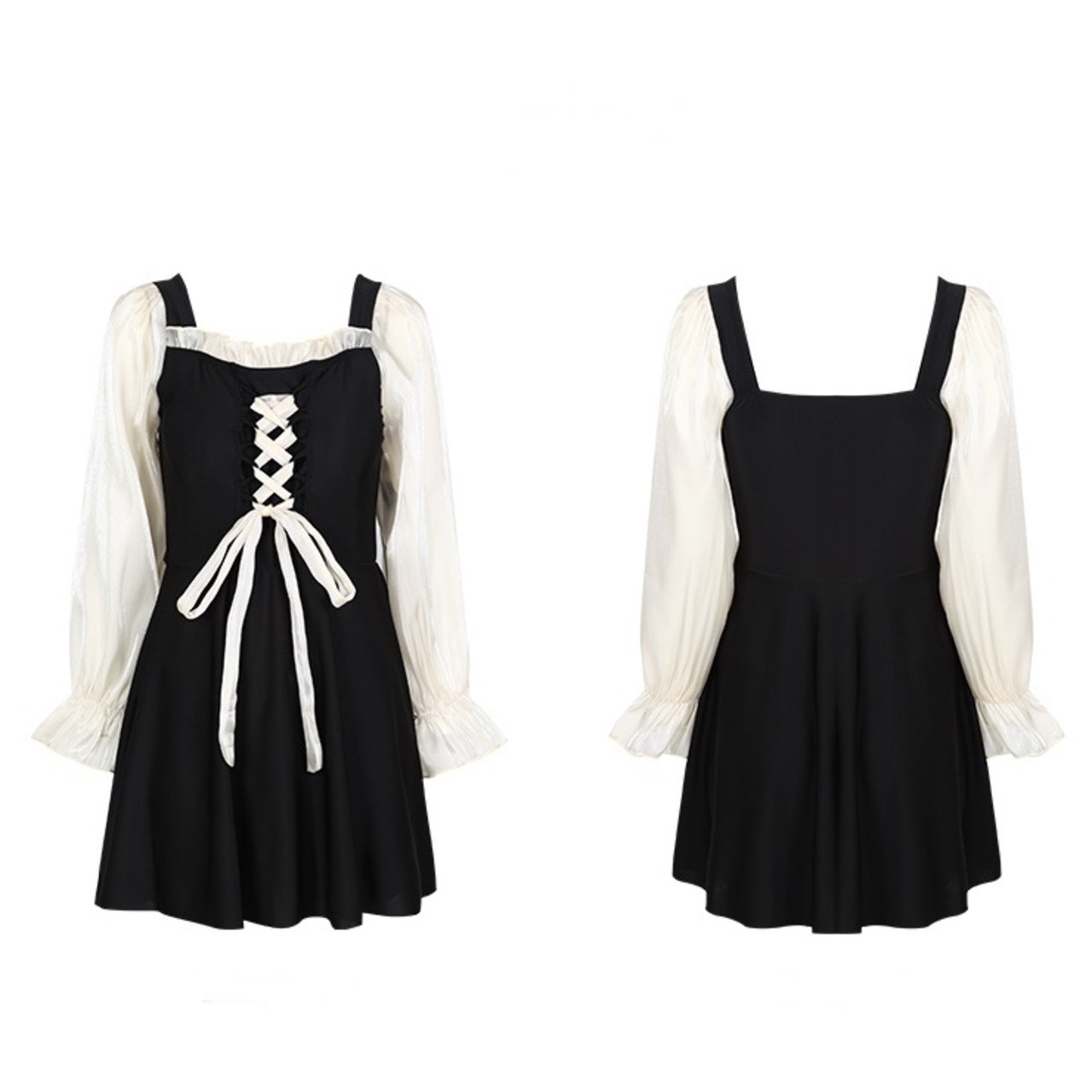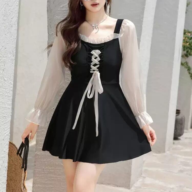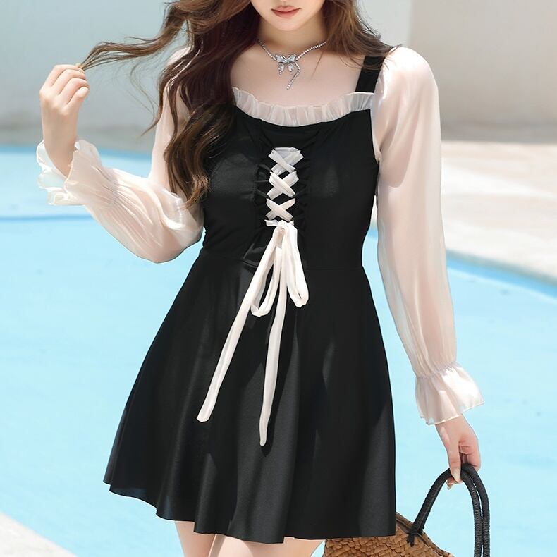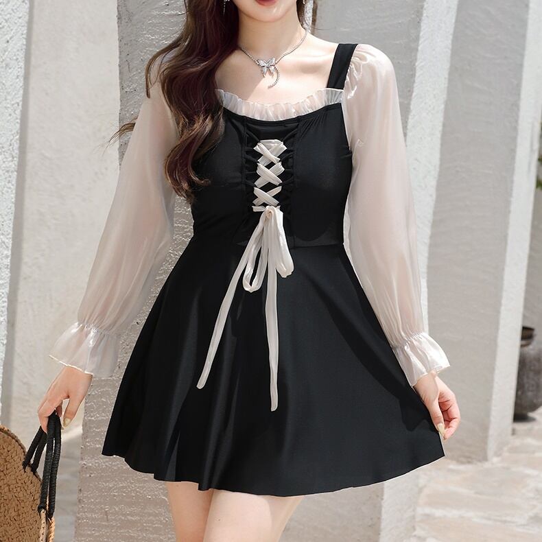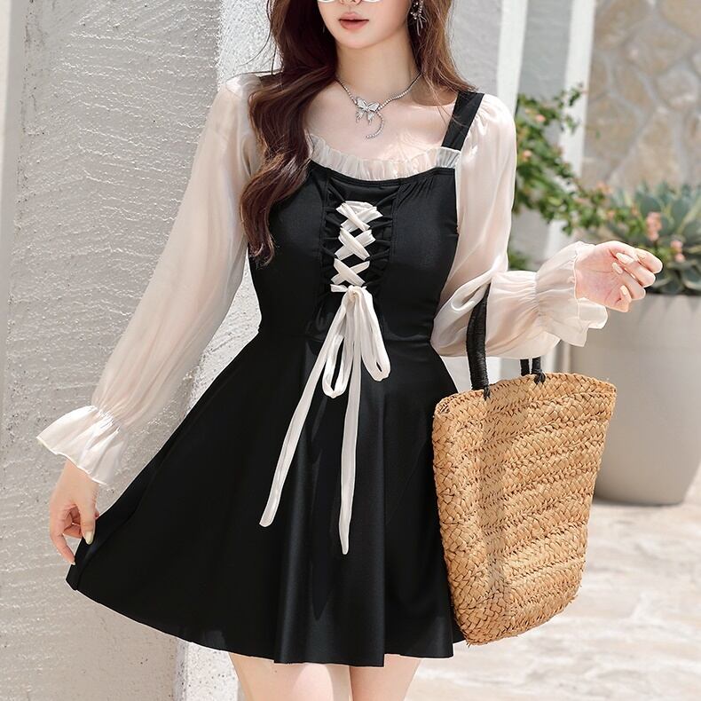 ワンピース水着 プラスサイズ 水着 スイムウェア レディース 二の腕カバー 長袖 リボン レース ハイウエスト シースルー シアー かわいい 大人可愛い きれいめ 華やか 大人っぽい おしゃれ ラブリー キュート ガーリー トレンド ベーシック フェミニン ヘルシー リゾート 旅行 温泉 プール 夏 海 美脚 脚長 着痩せ スタイルアップ 韓国 高見え 格上げ モテ 体型カバー インスタ映え 日除け スタイルカバー こなれ感 3XL 4XL 5XL 6XL 大きい ビッグサイズ ぽっちゃり ブラック | SPARKJOY レディースファッション