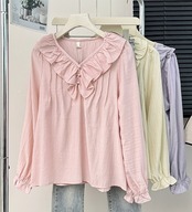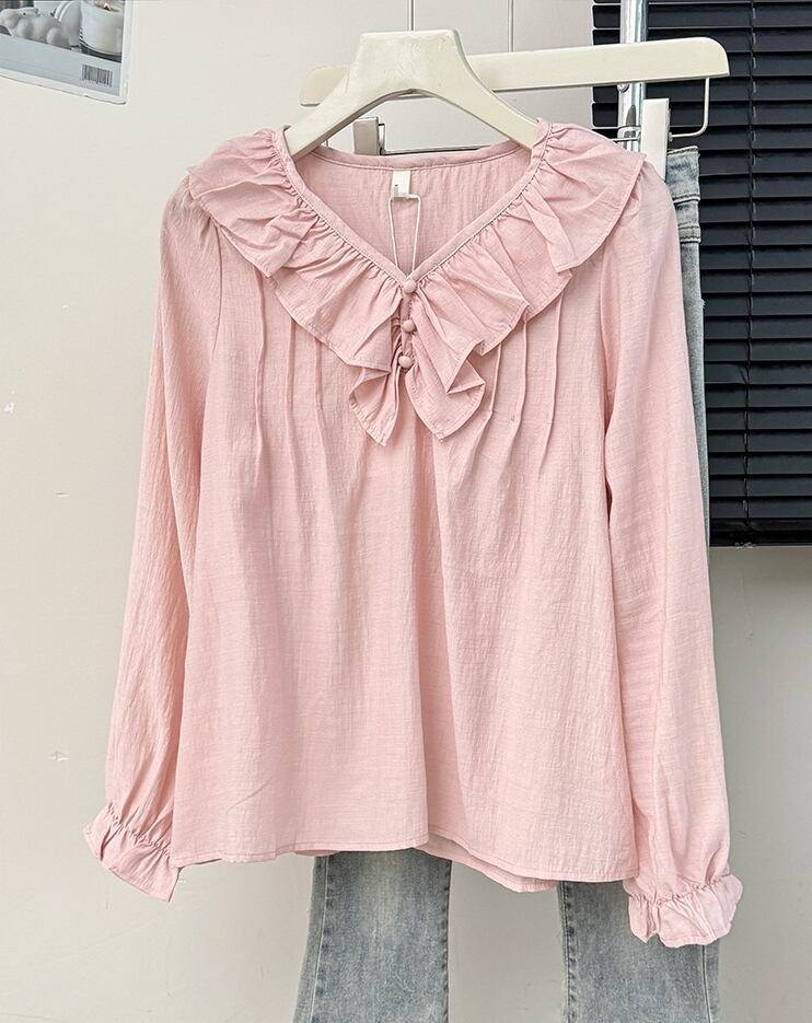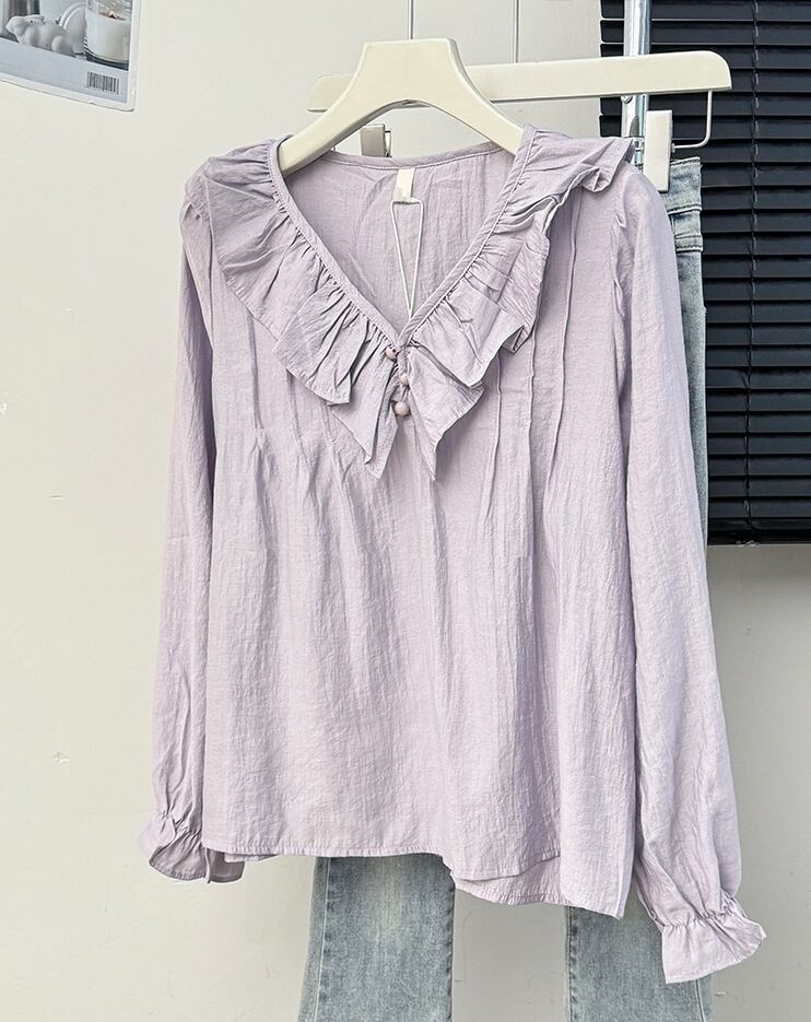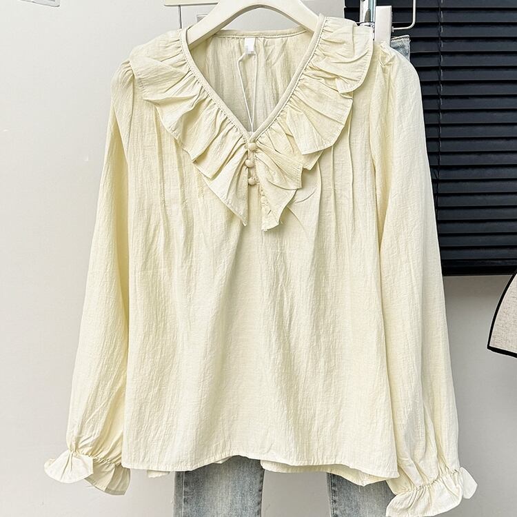 トップス ブラウス 長袖 Vネック フリル プルオーバー ショート丈 可愛い かわいい 大人可愛い きれいめ シンプル 上品 レトロ おしゃれ かっこいい カジュアル こなれ感 個性的 主役級 存在感 抜け感 春 夏 秋 ベーシック ナチュラル フェミニン ガーリー 清楚 無地 女性用 レディース ママ OL 通勤 オフィス 学生 通学 デート お出かけ お泊まり 女子会 旅行 リゾート 休日 カフェ ショッピング コンパ イベント 普段使い デイリー 着回し 重ね着 ワンサイズ トレンド モテ | SPARKJOY レディースファッション