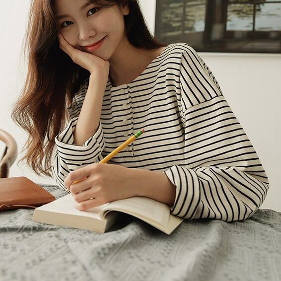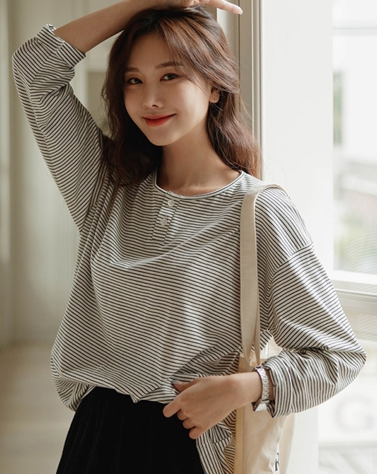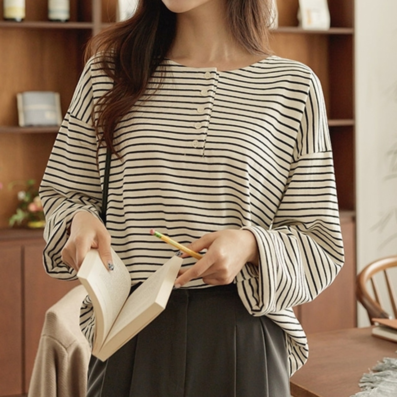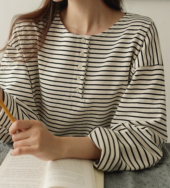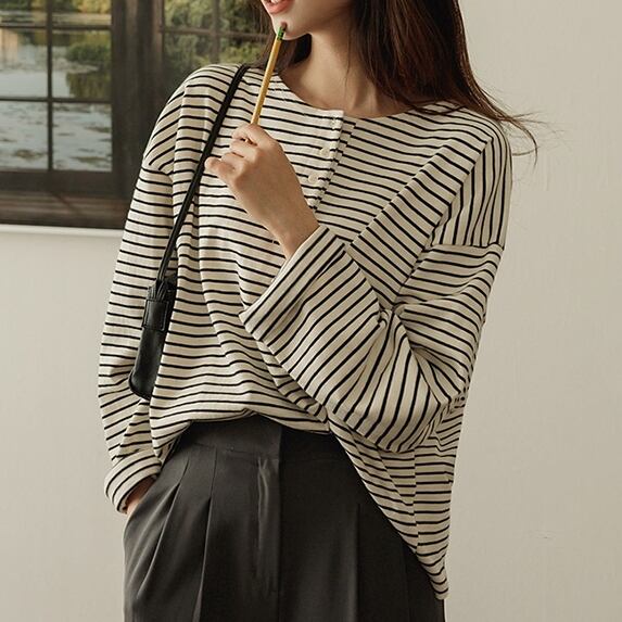 トップス カットソー Tシャツ 長袖 ラウンドネック ハーフボタン プルオーバー ミディアム丈 可愛い かわいい 大人可愛い きれいめ シンプル 上品 レトロ おしゃれ かっこいい カジュアル こなれ感 個性的 主役級 存在感 抜け感 ベーシック ナチュラル クール ボーダー柄 女性用 レディース ママ OL 通勤 オフィス 学生 通学 デート お出かけ お泊まり 女子会 旅行 リゾート 休日 アウトドア カフェ ショッピング コンパ イベント 普段使い デイリー 着回し 重ね着 M L XL | SPARKJOY レディースファッション