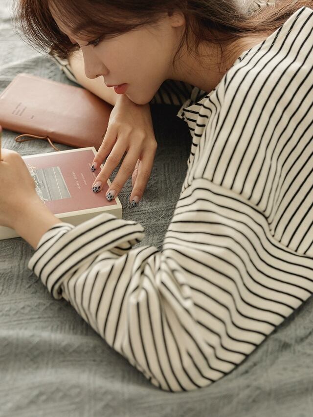 ミディアム丈のプルオーバーは、ボーダー柄がレトロ感を醸し出し、存在感を引き立てます。