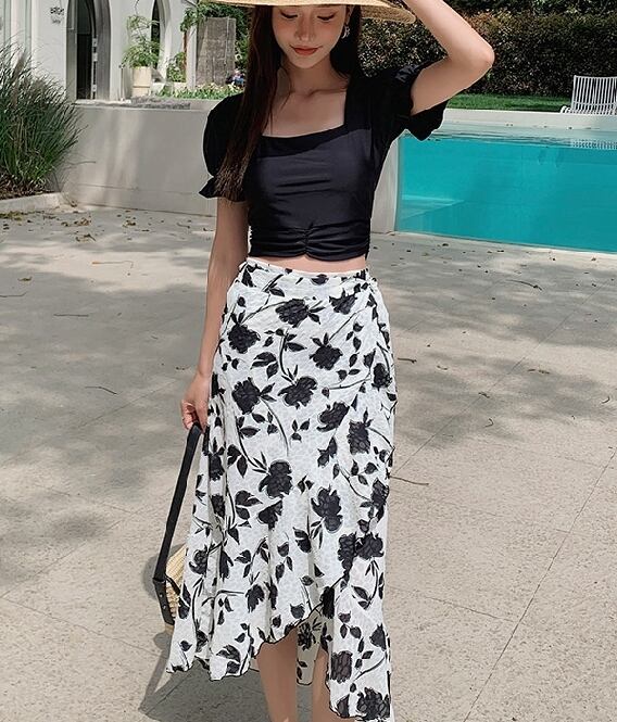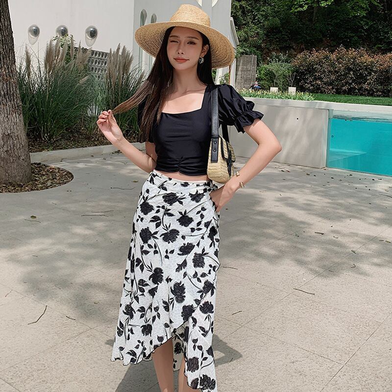 こちらのスイムウエアは、ボリューム袖とスクエアネックが絶妙にデザインされたセパレート水着です。