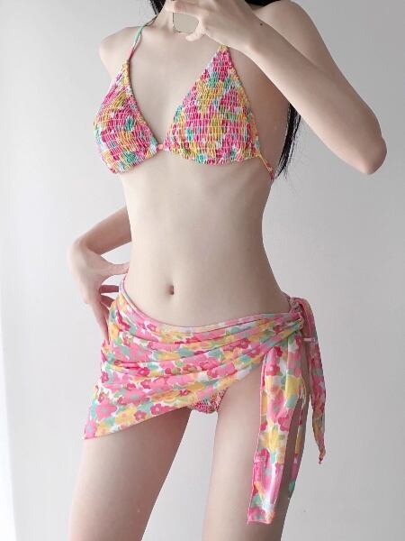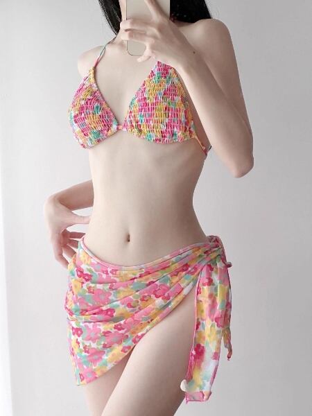 3点セット パレオ付き タイサイド 水着 ビキニ スイムウェア レディース 三角ビキニ ホルターネック ノンワイヤー パッド付き 伸縮性 シャーリング セット スリーピース 上下セット かわいい 大人可愛い カジュアル 華やか おしゃれ お洒落 主役級 キュート 個性的 花柄 リゾート 旅行 温泉 プール 夏 海 背中見せ 体型カバー スタイルカバー こなれ感 S M L | SPARKJOY レディースファッション