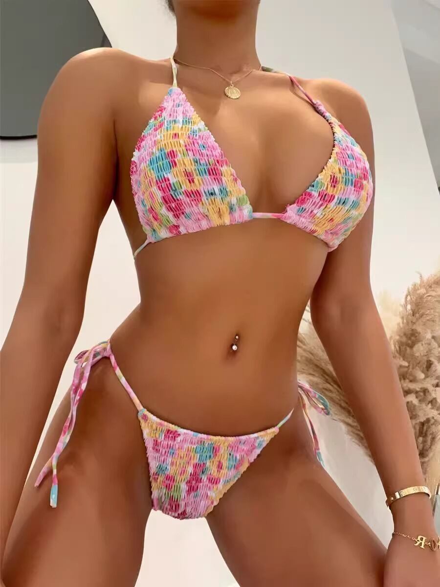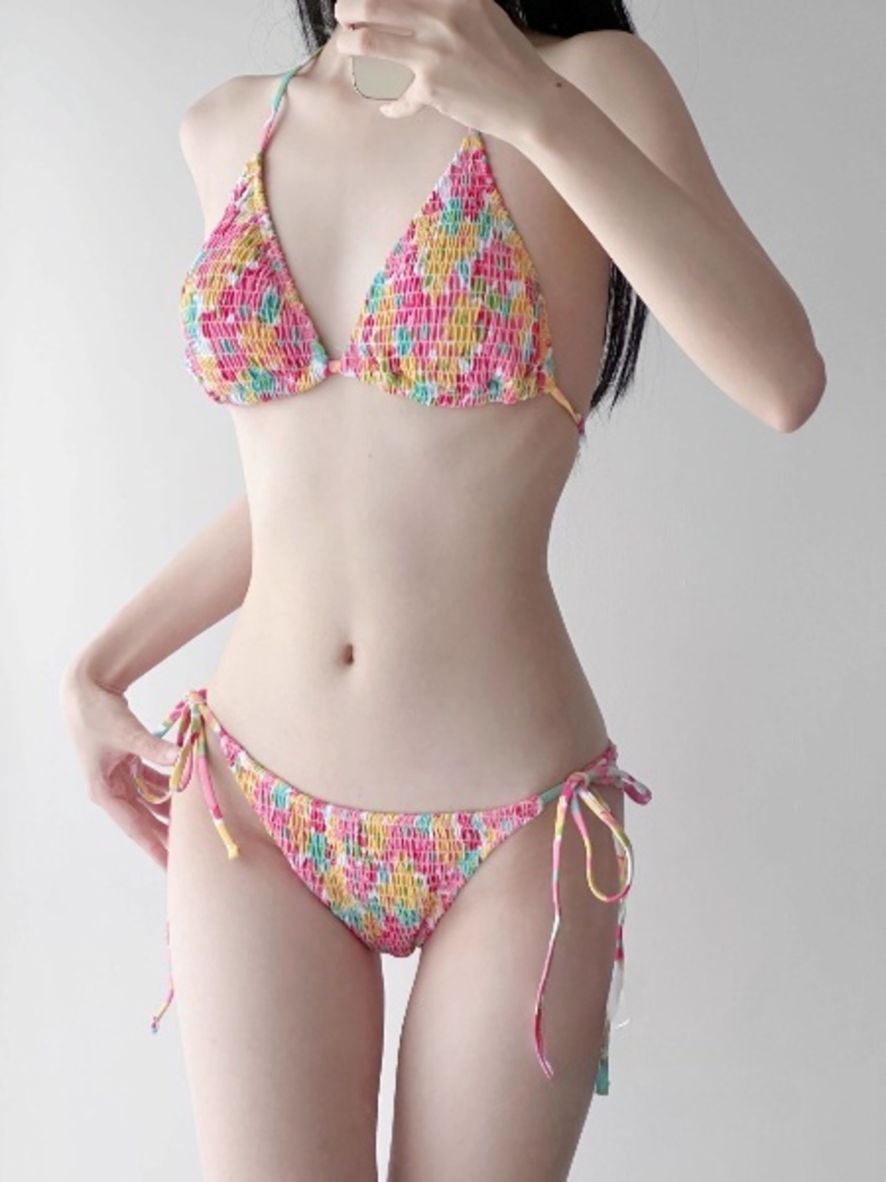カラフルな花柄が印象的な華やかビキニセット。シャーリング加工のトップスは柔らかく伸縮し、ノンワイヤーでも快適なフィット感を実現。ナチュラルで女性らしいシルエットを美しく演出します。