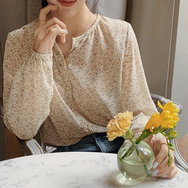 トップス ブラウス 長袖 クルーネック 前開き ボタン ミディアム丈 かわいい 可愛い 大人可愛い きれいめ シンプル 上品 レトロ おしゃれ かっこいい カジュアル レトロ こなれ感 個性的 主役級 存在感 抜け感 春 秋 ベーシック ナチュラル フェミニン 清楚 小花柄 女性用 レディース ママ OL 通勤 オフィス 学生 通学 デート お出かけ お泊まり 女子会 旅行 休日 カフェ ショッピング 会議 MTG プレゼン イベント コンパ 普段使い デイリー 着回し 重ね着 S M L XL トレンド | SPARKJOY レディースファッション