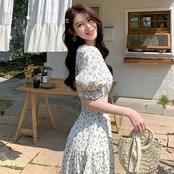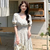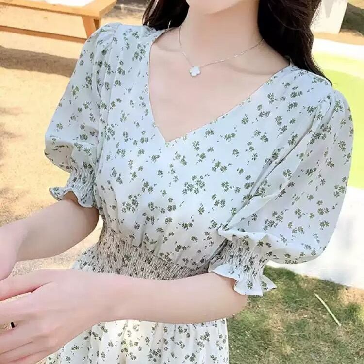 軽やかなシフォン素材を使用したシフォンワンピ、パフスリーブがフェミニンな印象を与える一着です。