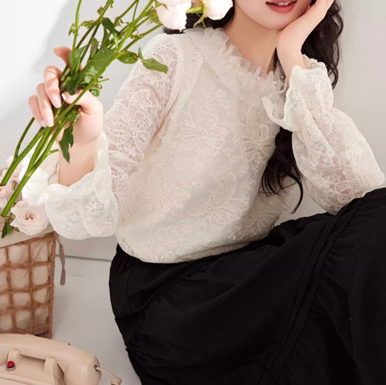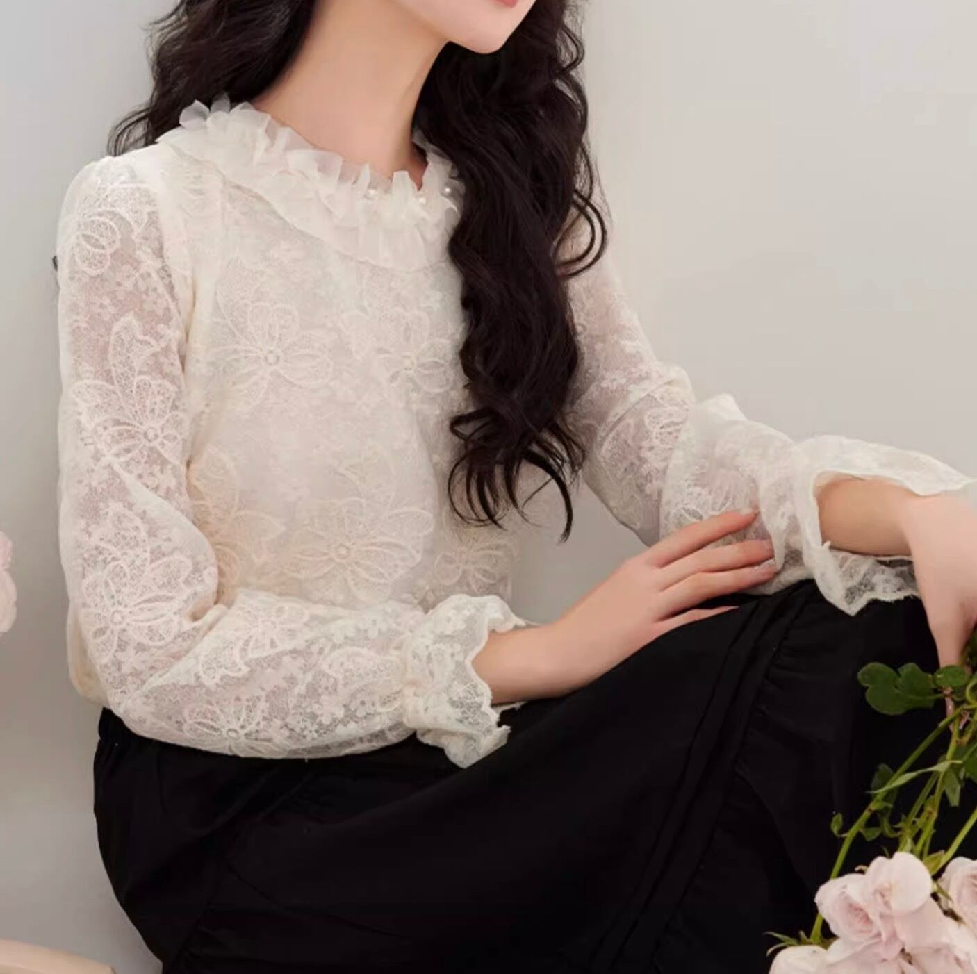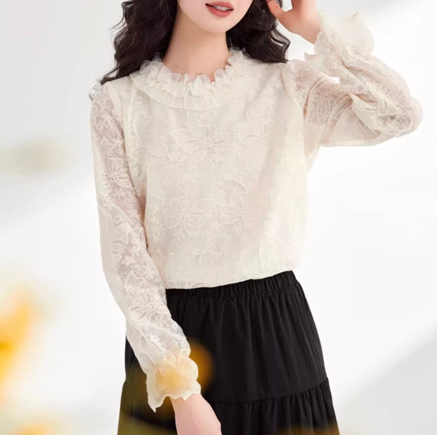 シンプルでありながら、洗練された魅力を放つレディーストップスブラウスは、デートスタイルからカジュアルなお出かけまで幅広く活躍します。特徴的なレース素材を使用し、透け感のあるデザインが大人可愛い印象を与えてくれます。ミディアム丈とボリュームのあるフレアスリーブが、おしゃれでありながらもリラックスした雰囲気を演出します。
