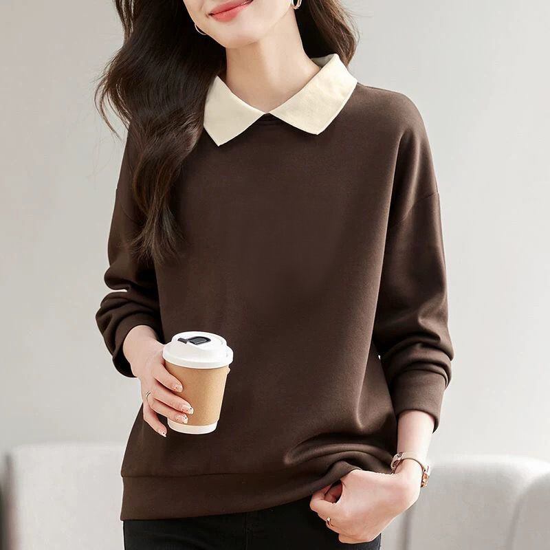 トップス スウェット 長袖 襟付き プルオーバー ミディアム丈 かわいい 可愛い 大人可愛い きれいめ シンプル 上品 レトロ おしゃれ かっこいい カジュアル レトロ こなれ感 個性的 主役級 存在感 抜け感 秋 冬 ベーシック ナチュラル キュート 無地 orプリント 女性用 レディース ママ OL 通勤 オフィス 学生 通学 デート お出かけ お泊まり 女子会 旅行 休日 カフェ ショッピング アウトドア イベント コンパ 普段使い デイリー 着回し 重ね着 M L XL 2XL トレンド モテ | SPARKJOY レディースファッション
