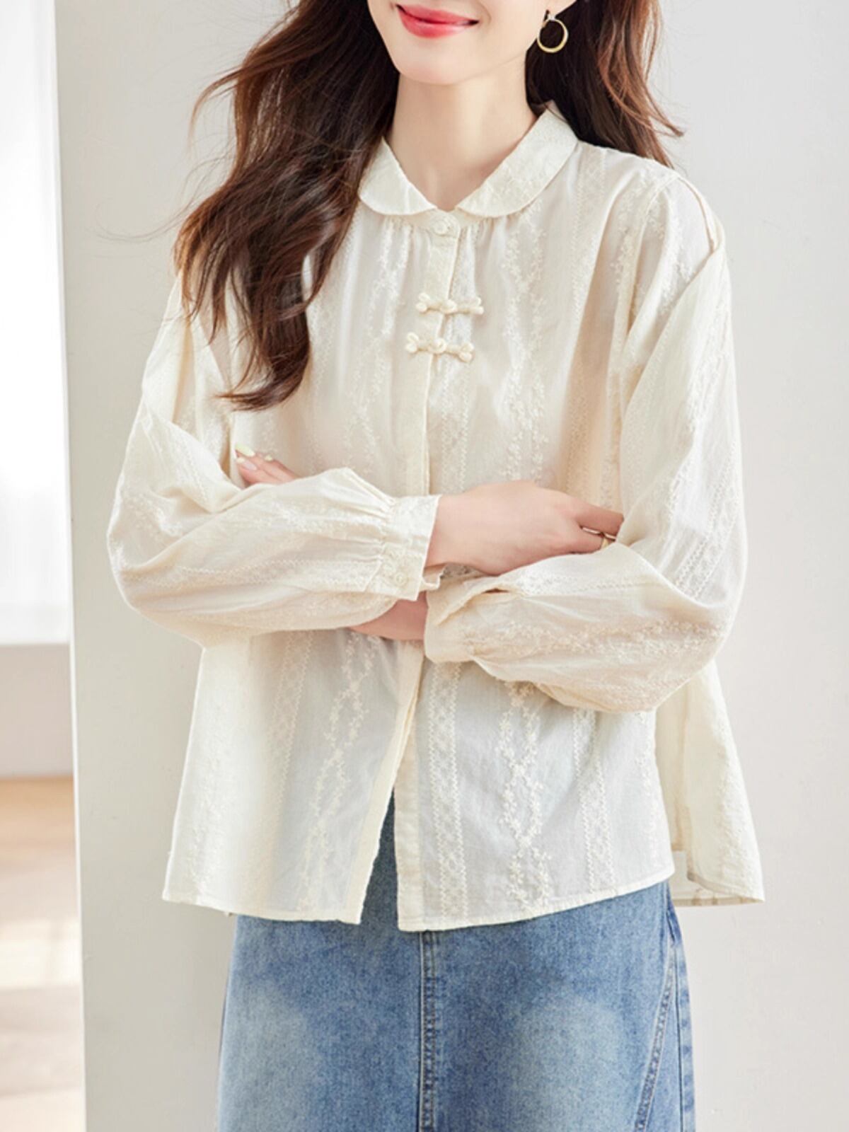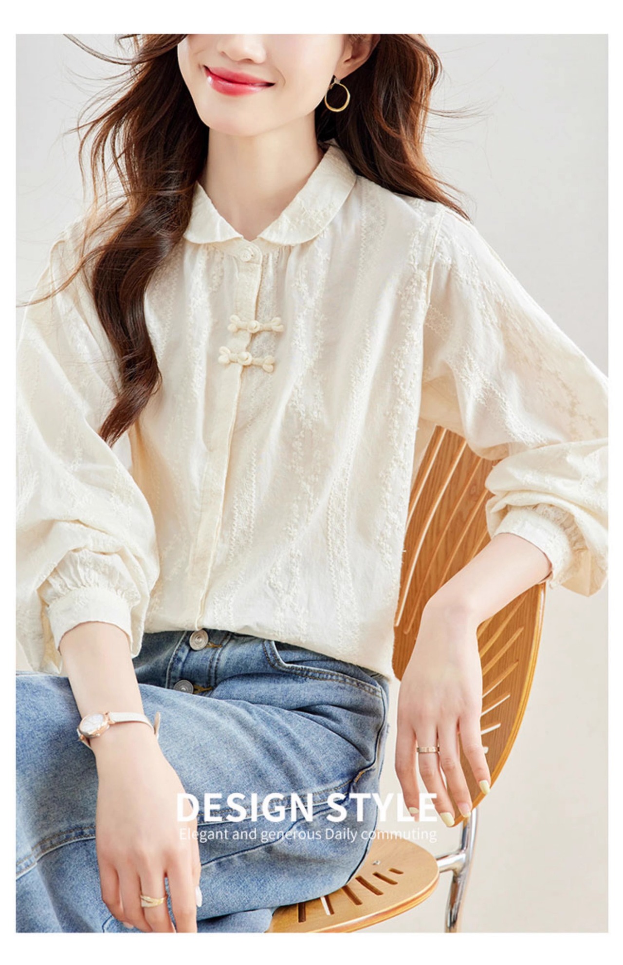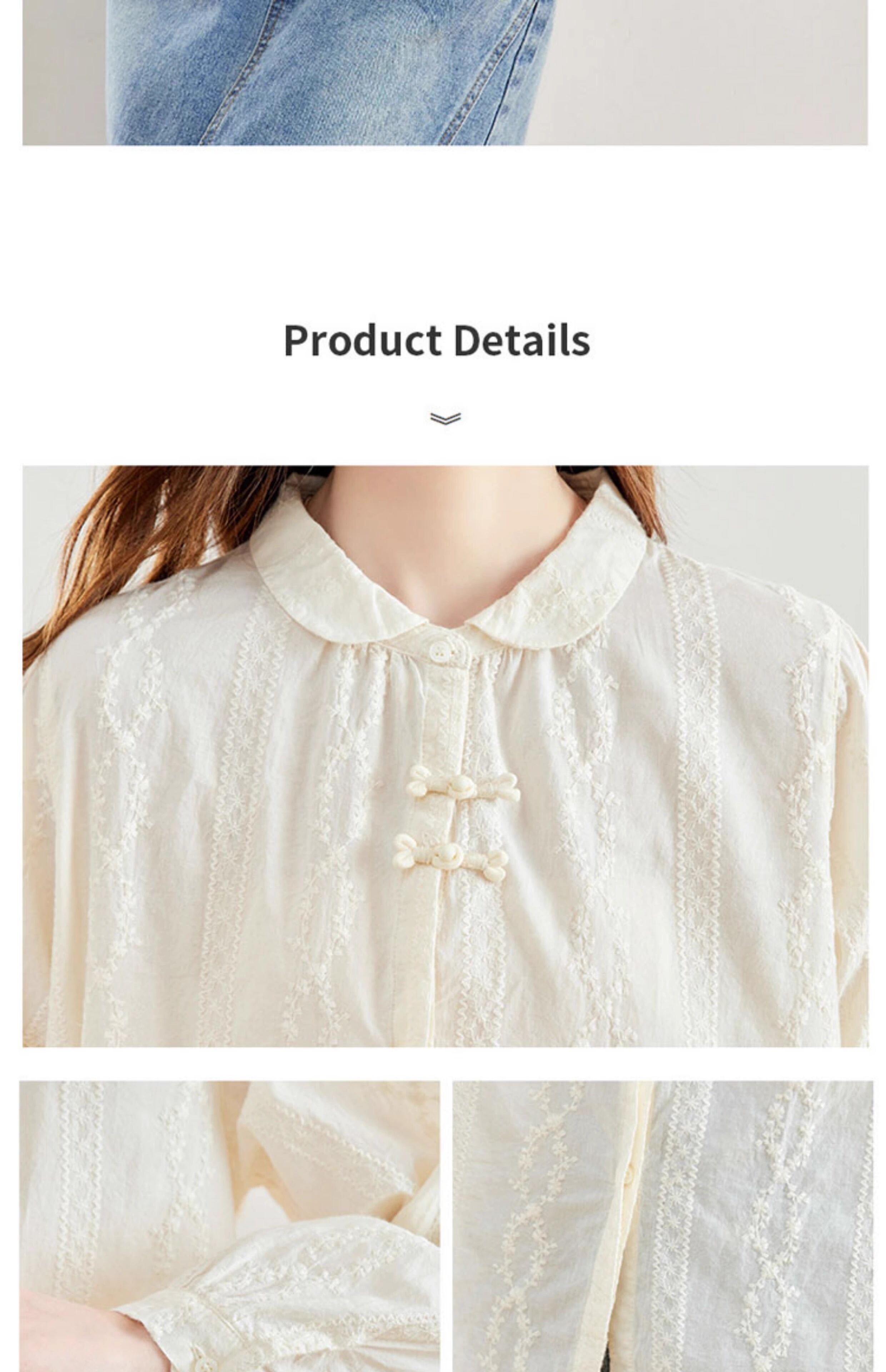 大人可愛いレディーストップスのご紹介です!前開きのデザインで、Uネックの襟付きで、フェミニンな雰囲気を演出。レースや刺繍のディテールが美しく、透け感のある薄手綿素材で春夏のお出かけにぴったりです。カジュアルスタイルにキュートなアクセントを加え、女子会やデートにも最適なアイテムです。
