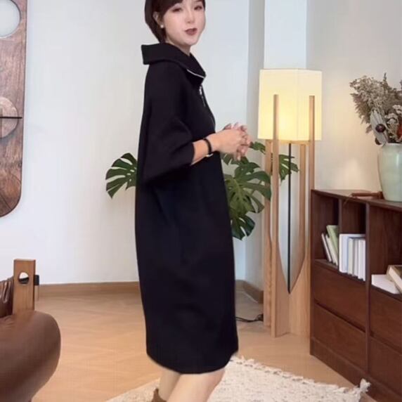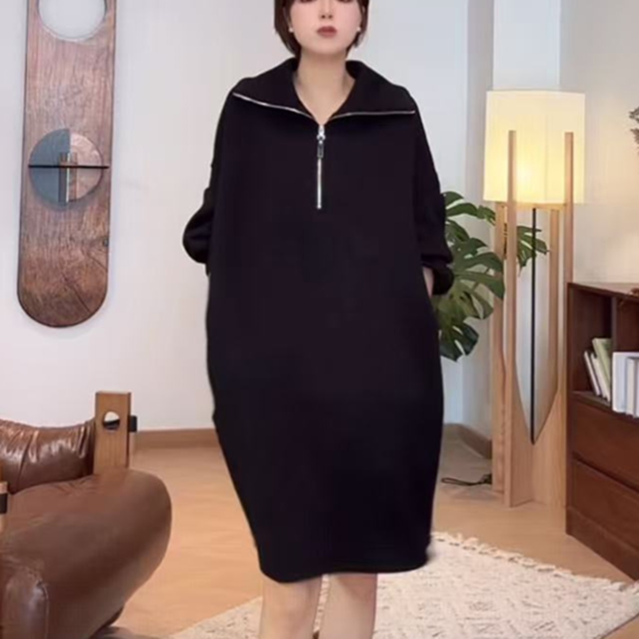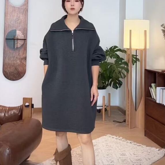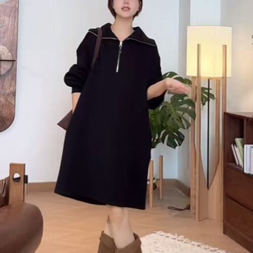 この長袖のワンピースは、襟付きのビックカラーとハーフジップデザインが特徴的で、一枚でとてもおしゃれな印象を与えてくれます。