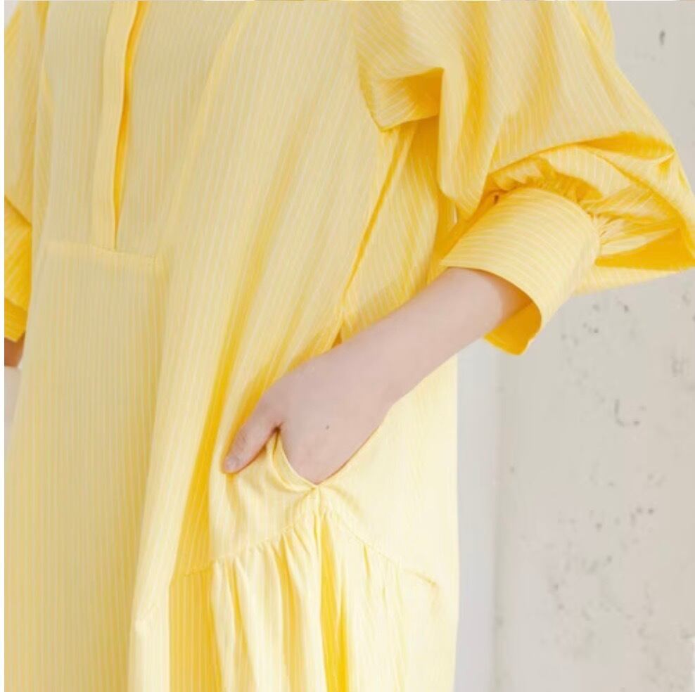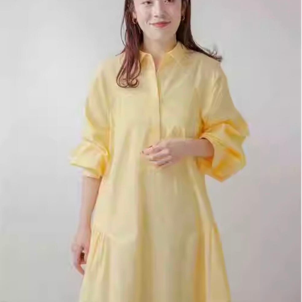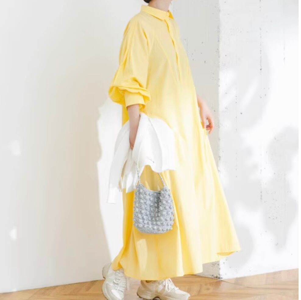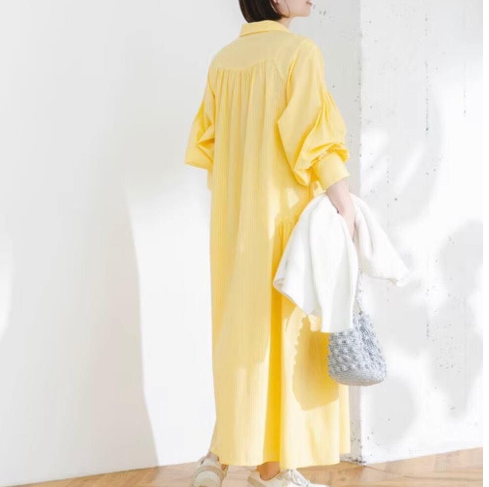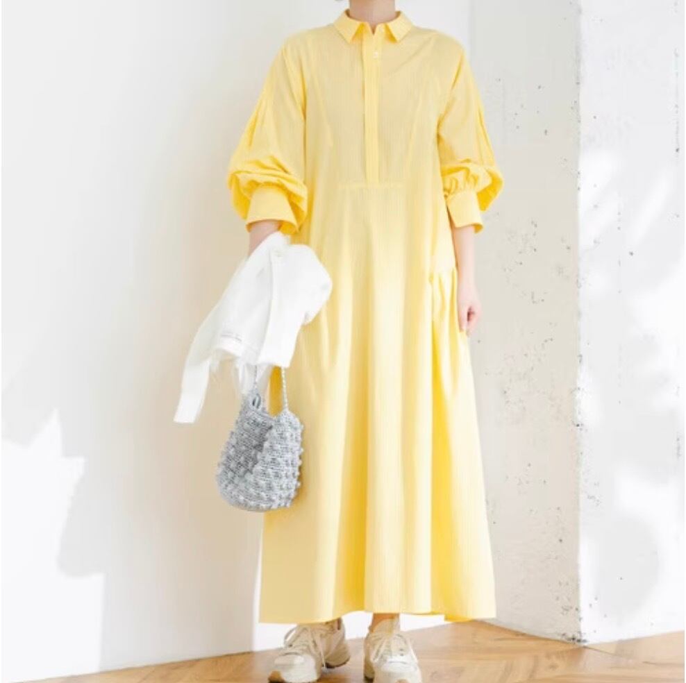 大人可愛い印象を与えるイエローワンピースが登場!シャツワンピースのデザインに、ボリューム袖とイレギュラーヘムが特徴的で、デートや女子会、お出かけシーンで大活躍間違いなし!前開きのファスナー仕様で着脱もスムーズ。セミフレアのシルエットが心地よく、シンプルながらも存在感を引き立ててくれる一枚です。ゆったりとしたサイズ感は、ラフでもきれいめでも幅広いスタイルに合わせられ、休日のお出かけや旅行にもぴったりです!