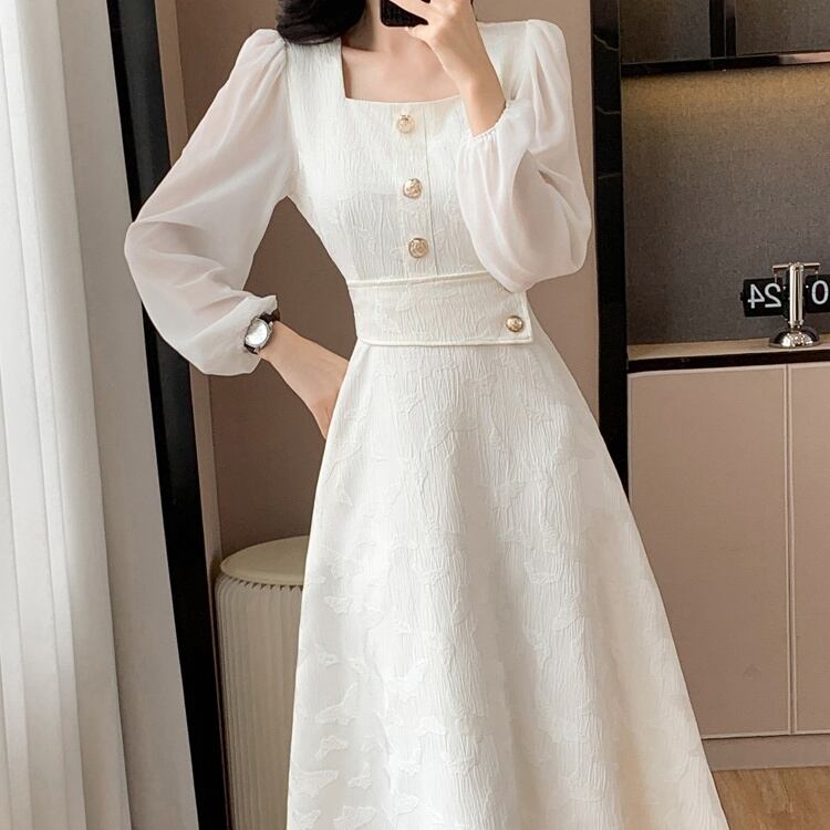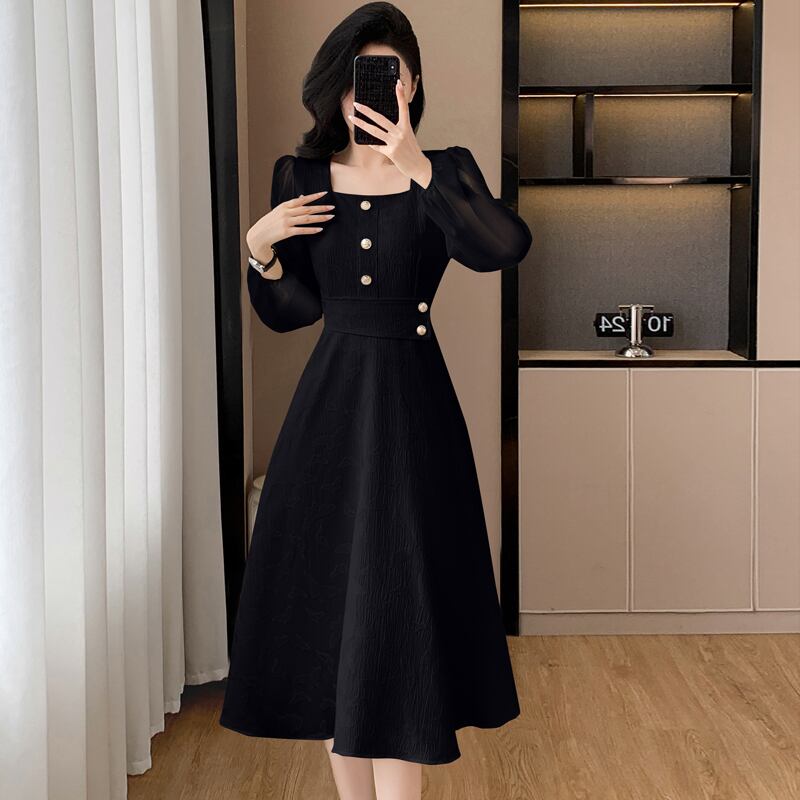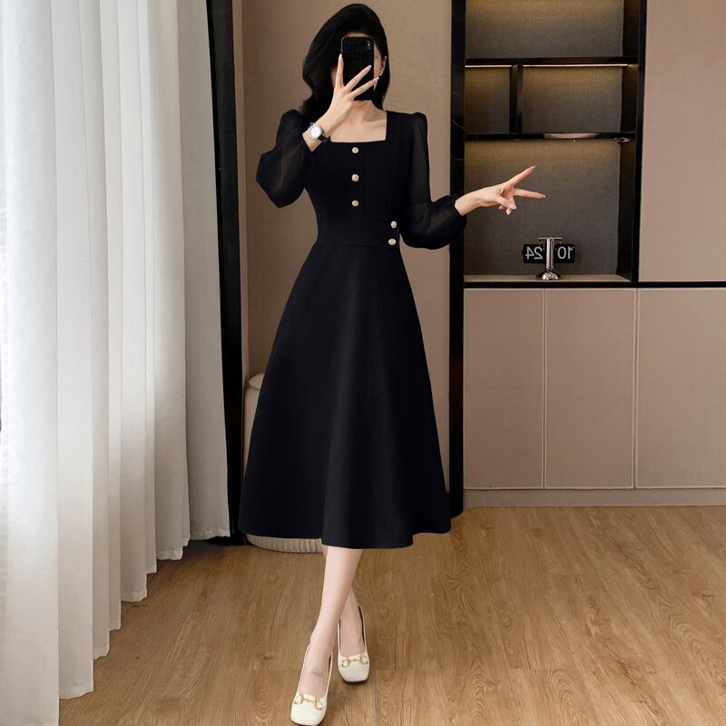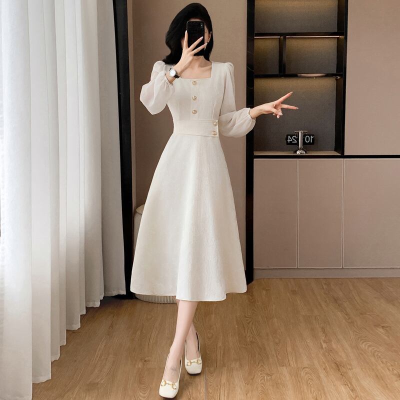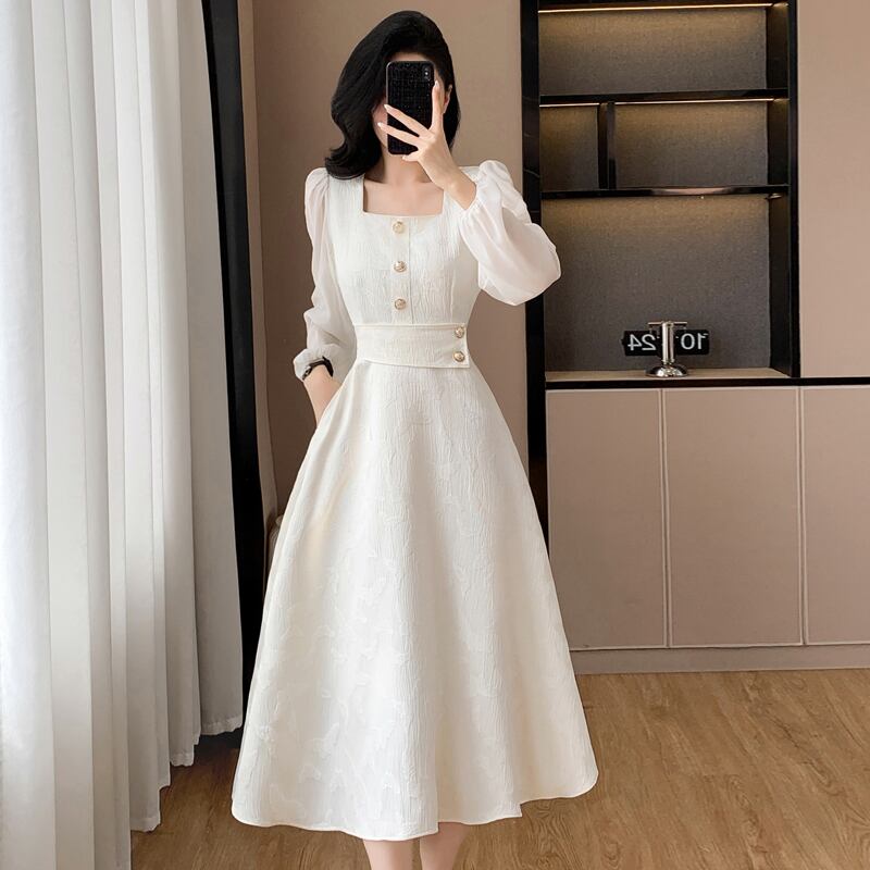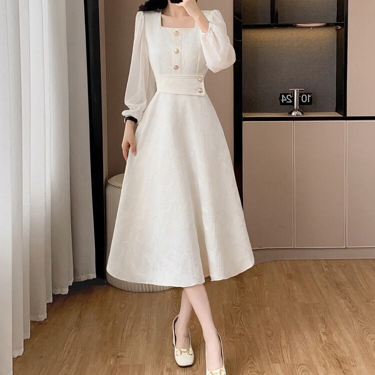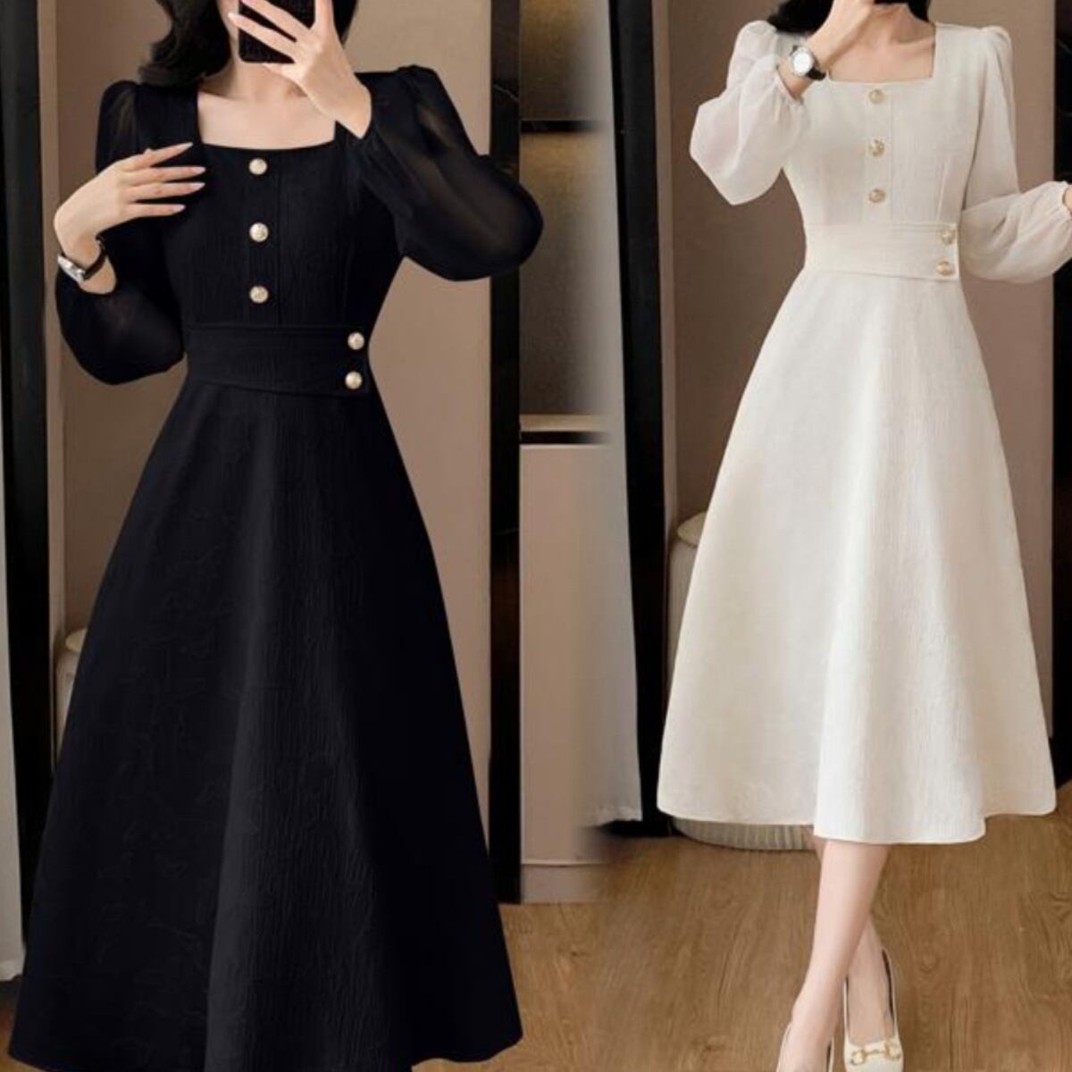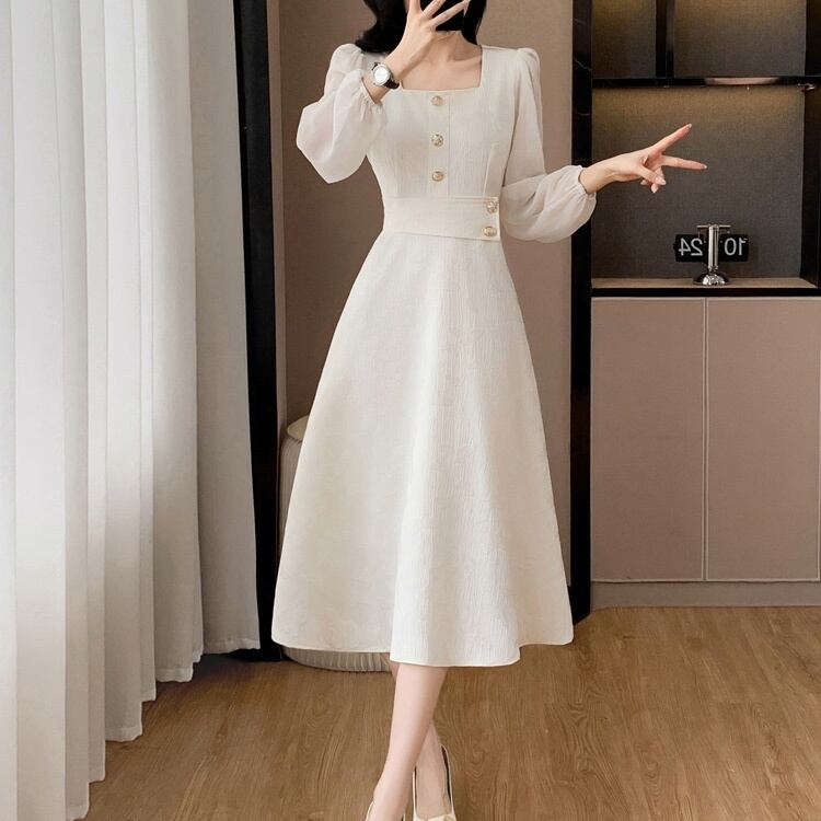 ワンピドレス スクエアカラー ハイウエスト スリム フレア ミディアム丈 ボタン レディース ワンピース 大人可愛い きれいめ 上品 謝恩会 二次会 披露宴 デート お出かけ パーティー イベント レストラン ホテル ガーデン ショッピング コンサート 合コン コンパ カフェ 婚活 アースカラー モノトーン 韓国 オルチャン コーデ 楽ちん 美脚 脚長 モテ 清楚 トレンド 流行 インスタ映え 定番 M L XL 2XL 3XL 4XL ブラック オフホワイト ベーシックカラー 大人カラー 秋カラー | SPARKJOY レディースファッション