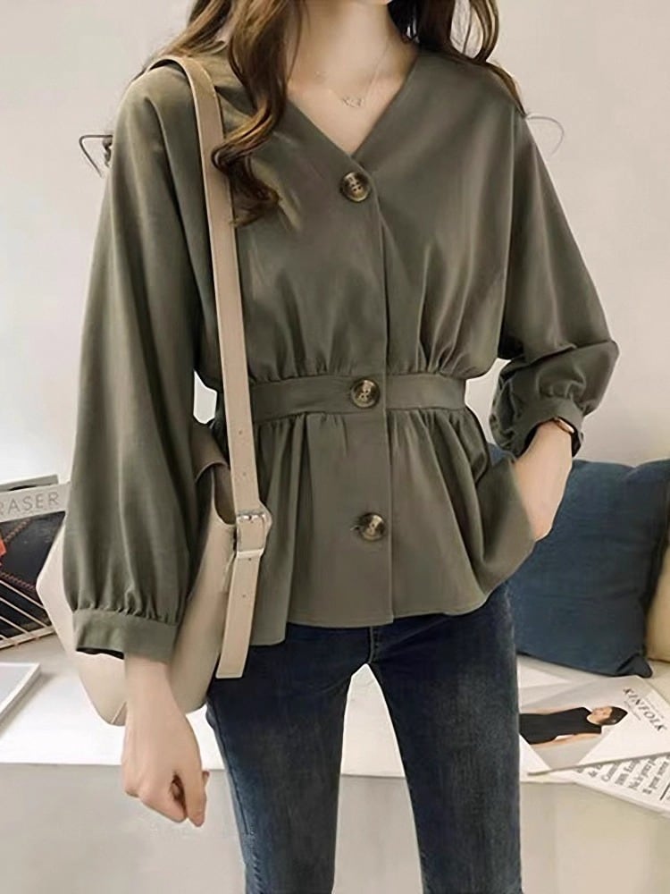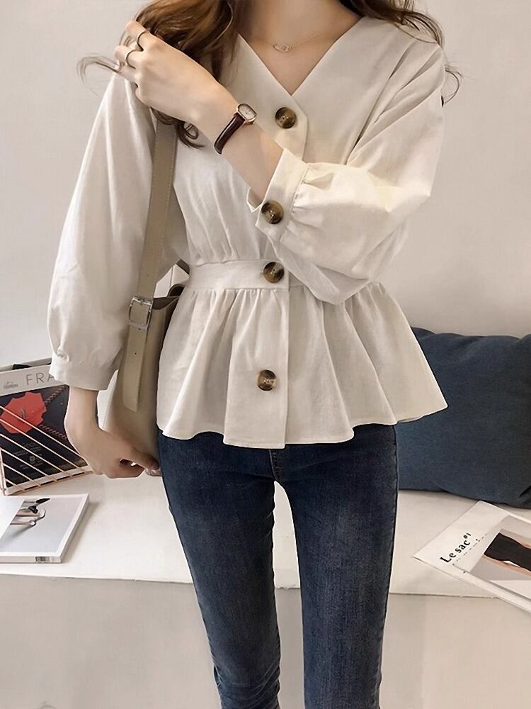 レディース トップス シャツ ブラウス 上着 ミモレ 7分袖 長袖 ボリューム袖 Vネック 襟なし ノーカラー フレア セミフレア ペプラム フェミニン フリル ウエストマーク コンサバ ボタン かわいい 大人可愛い きれいめ シンプル 上品 おしゃれ こなれ感 ガーリー 主役級 とろみ感 抜け感 キュート 都会的 クラシカル ベーシック ナチュラル 無地 春 秋 会議 MTG プレゼン オフィス ビジネス OL 通勤 デート お出かけ イベント 旅行 レストラン 女子会 休日 お花見 合コン コンパ カ | SPARKJOY レディースファッション