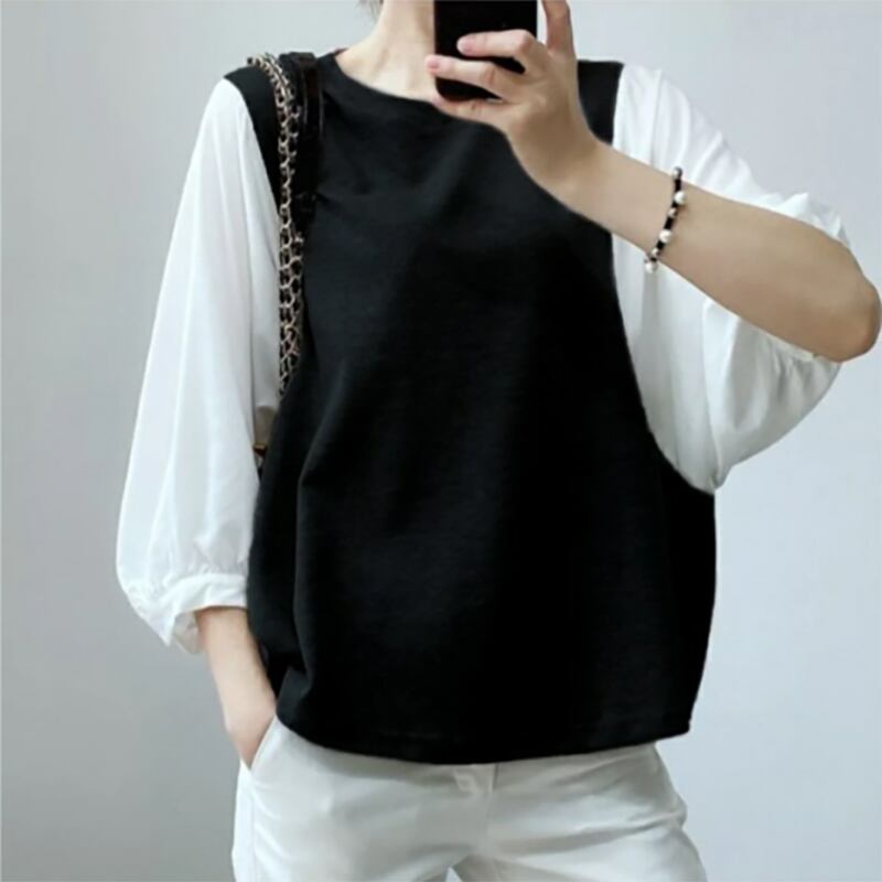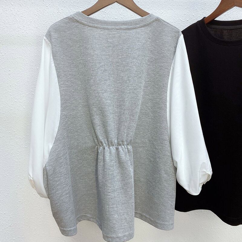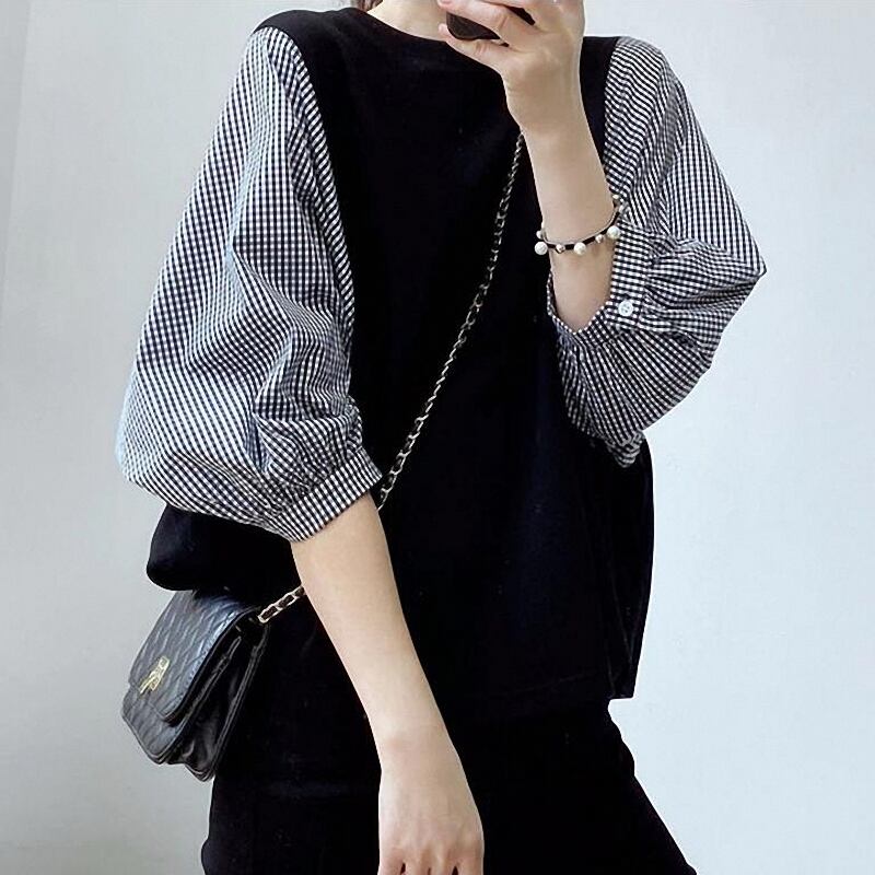 プルオーバーシャツ クルーネック ドッキング レディース トップス フェミニン かわいい 大人可愛い シンプル カジュアル おしゃれ こなれ感 ラフ 個性的 キュート チェック OL 通勤 デート お出かけ お泊まり 旅行 レストラン 女子会 休日 ショッピング コンサート ライブ 合コン コンパ カフェ モノトーン 韓国 オルチャン コーデ 楽ちん 体型カバー 普段使い 着回し モテ トレンド 流行 インスタ映え 定番 M L XL ゆったり ブラック グレー ベーシックカラー 大人カラー 秋カラー | SPARKJOY レディースファッション