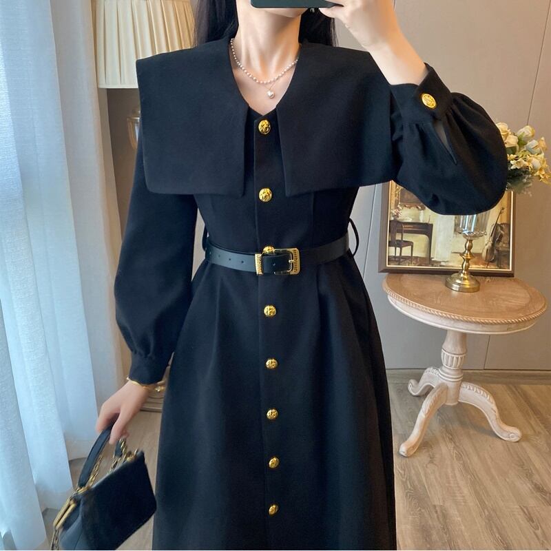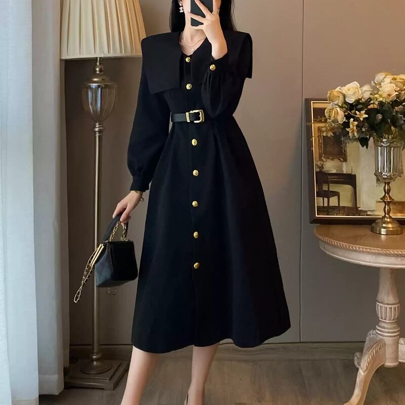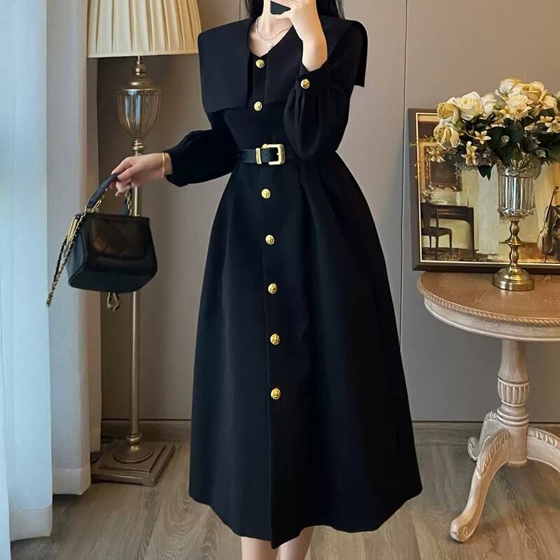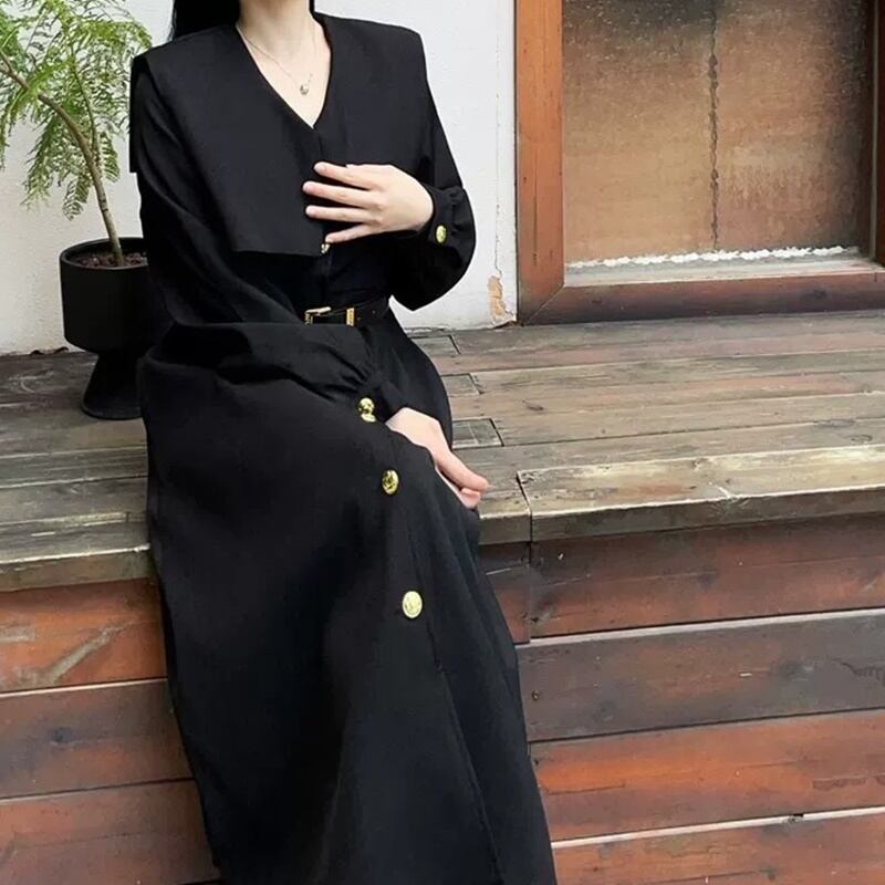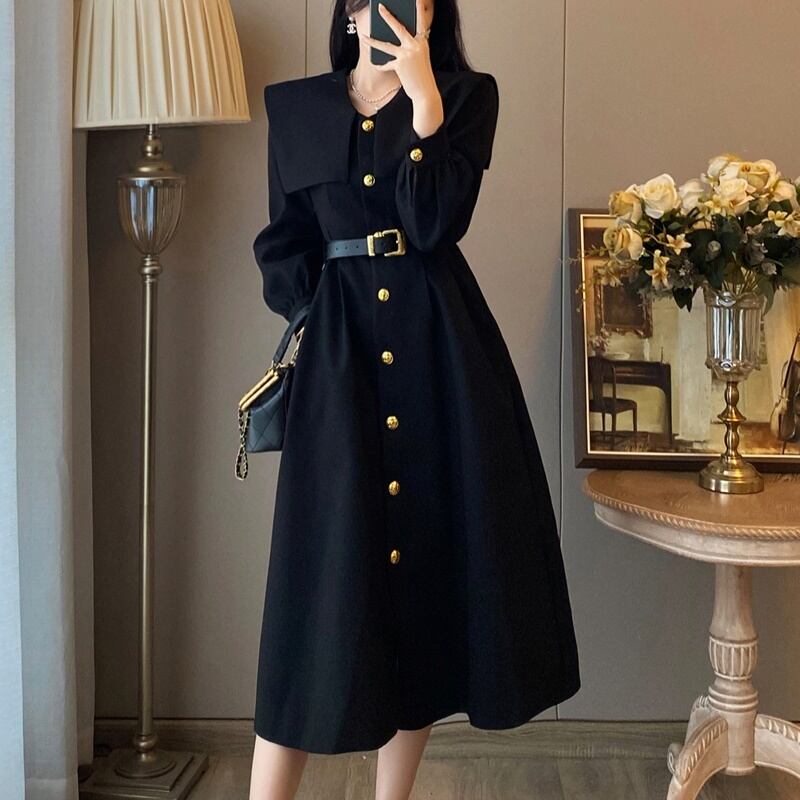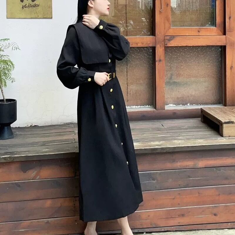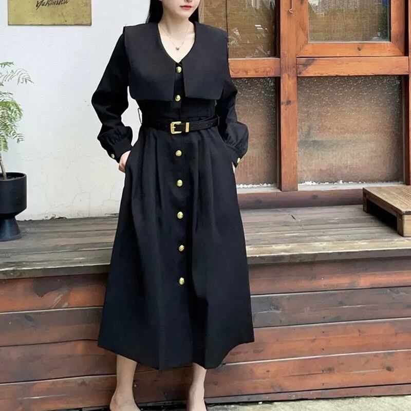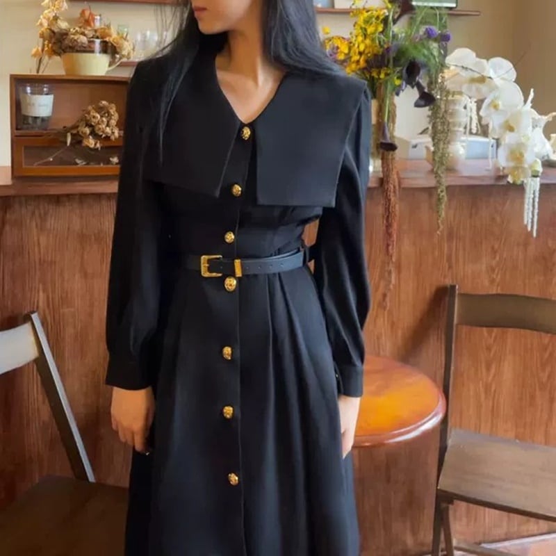 ドレスワンピ ベルト レディース ワンピース フレア 膝下 ミモレ 長袖 襟付き スリム 細身 Aライン ポケット 前開き ボタン ヴィンテージ 大人可愛い きれいめ 上品 おしゃれ かっこいい レトロ クール モード系 エレガント モダン 主役級 存在感 とろみ感 かっちり 都会的 ラグジュアリー オフィス ビジネス OL 通勤 デート お出かけ パーティー イベント 旅行 女子会 海外 韓国 オルチャン 美脚 脚長 普段使い 着回し モテ トレンド 流行 インスタ映え S M L XL ブラック | SPARKJOY レディースファッション