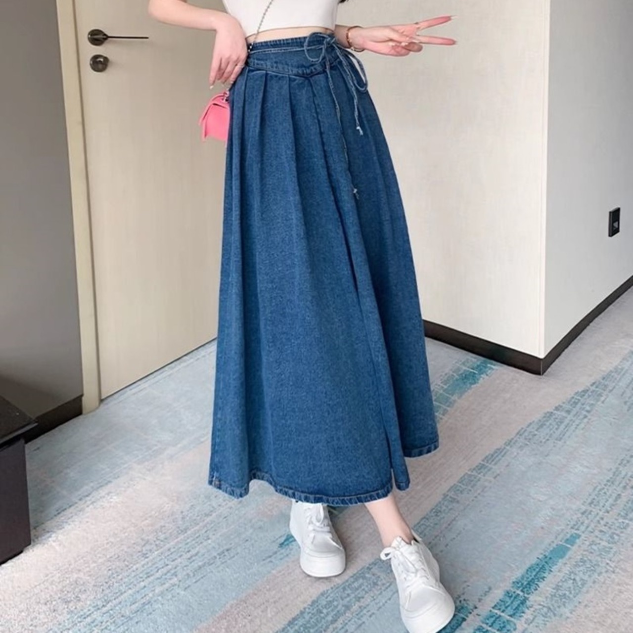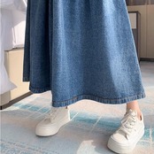 カジュアルなデニム素材と、エレガントなロング丈のフレアシルエットが魅力の一着です!普段使いやお出かけにもぴったりなデザインです。