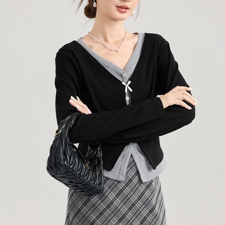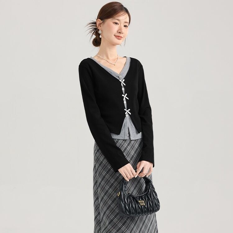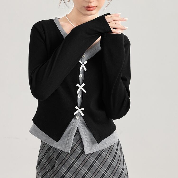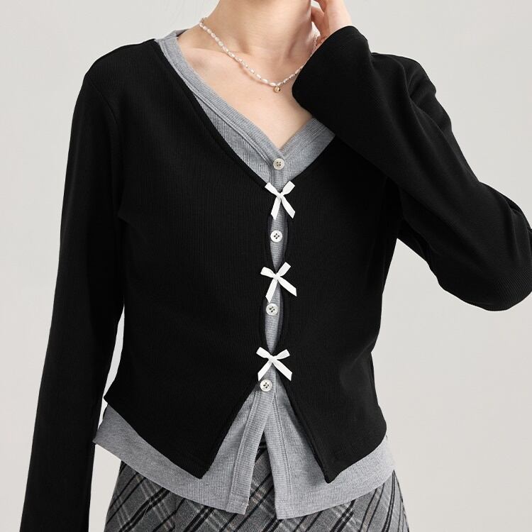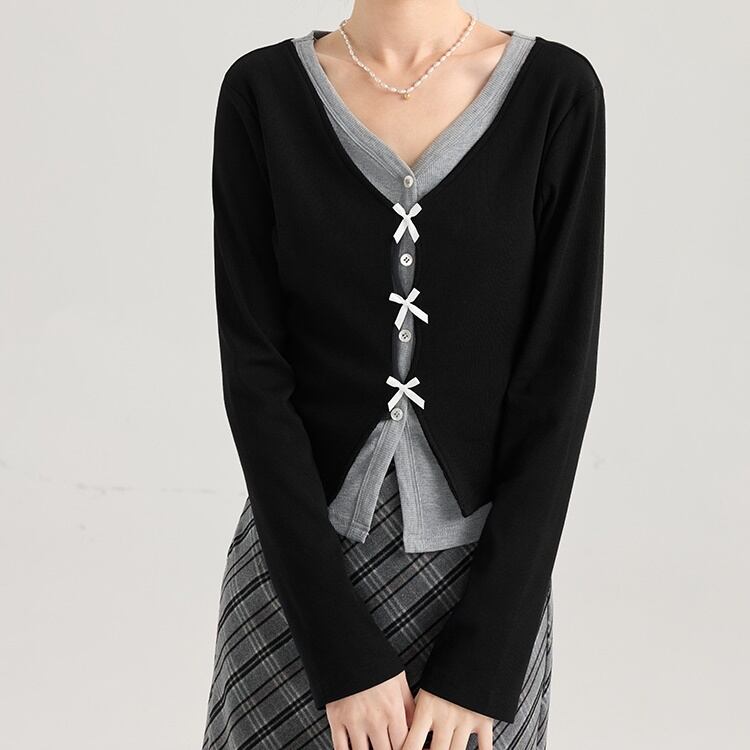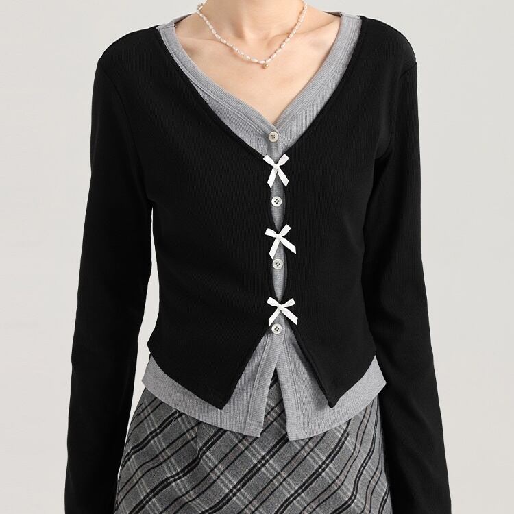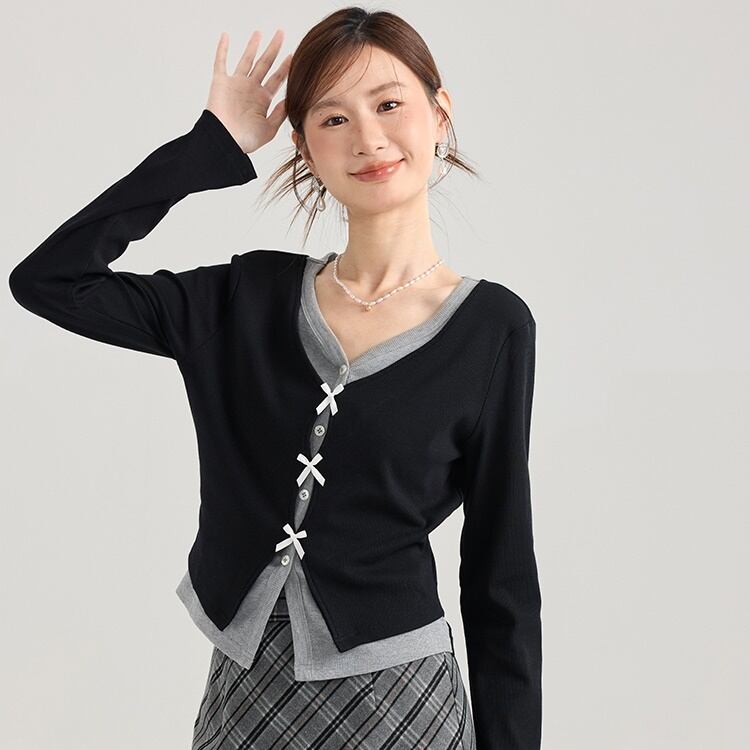 ニット カーディガン レイヤード プラスサイズ レディース トップス 長袖 Vネック スリム 細身 フェミニン リボン 前開き ボタン かわいい 大人可愛い きれいめ シンプル 上品 おしゃれ こなれ感 ガーリー エレガント モダン 抜け感 キュート 都会的 ナチュラル OL 通勤 デート お出かけ 旅行 レストラン 合コン コンパ カフェ 婚活 モノトーン 韓国 オルチャン コーデ 楽ちん 暖かい 普段使い 着回し モテ 清楚 トレンド 流行 インスタ映え 定番 M L XL 2XL 3XL ブラック | SPARKJOY レディースファッション