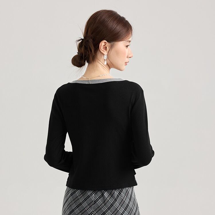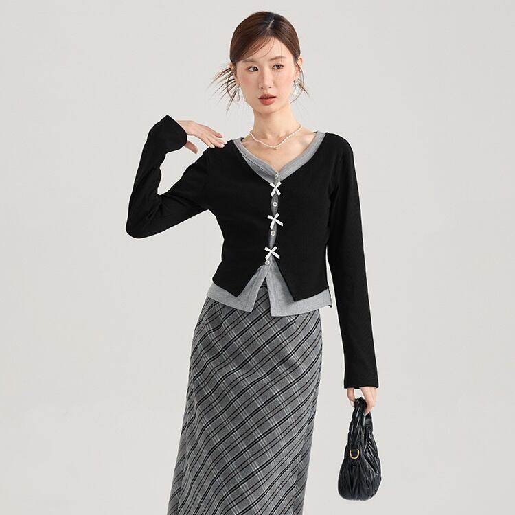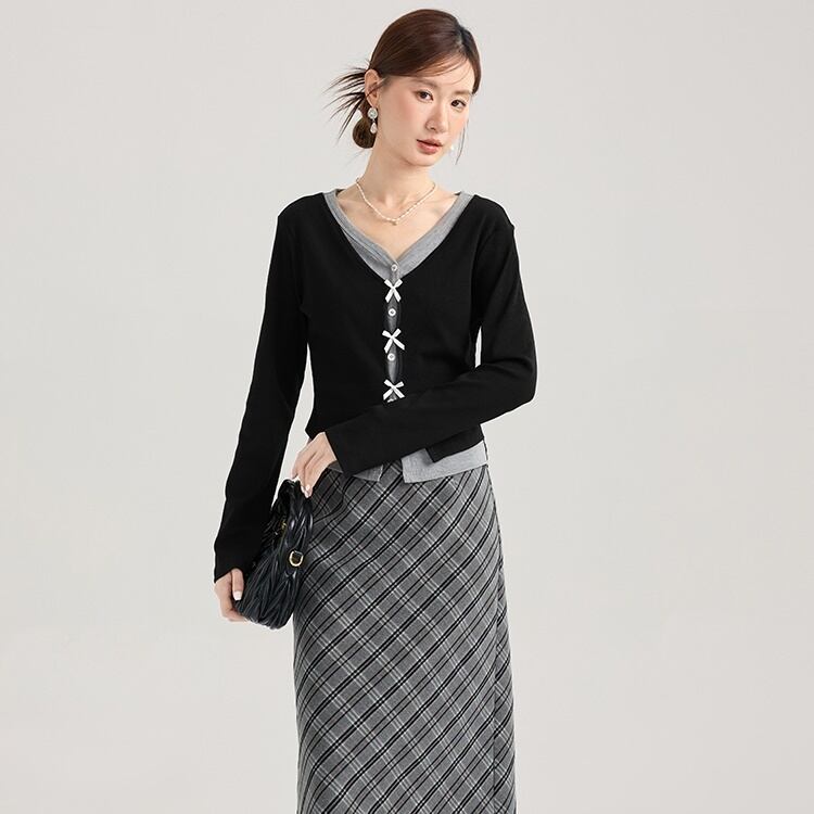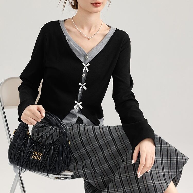 ふんわりとした素材感とラフなレイヤードスタイルがポイントで、長袖とVネックデザインが、シンプルながらもフェミニンな印象を与えます。