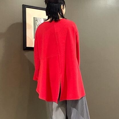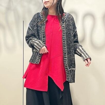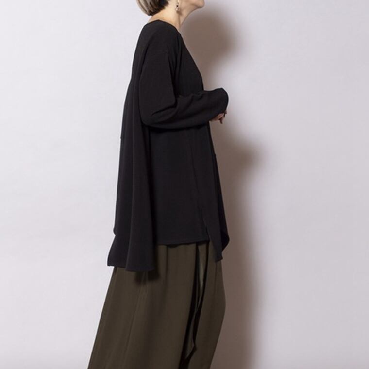 ミディアム丈とアシンメトリーなシルエットが、シンプルながらも個性的な印象を与えます。