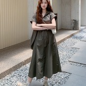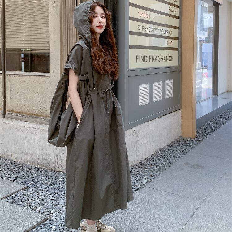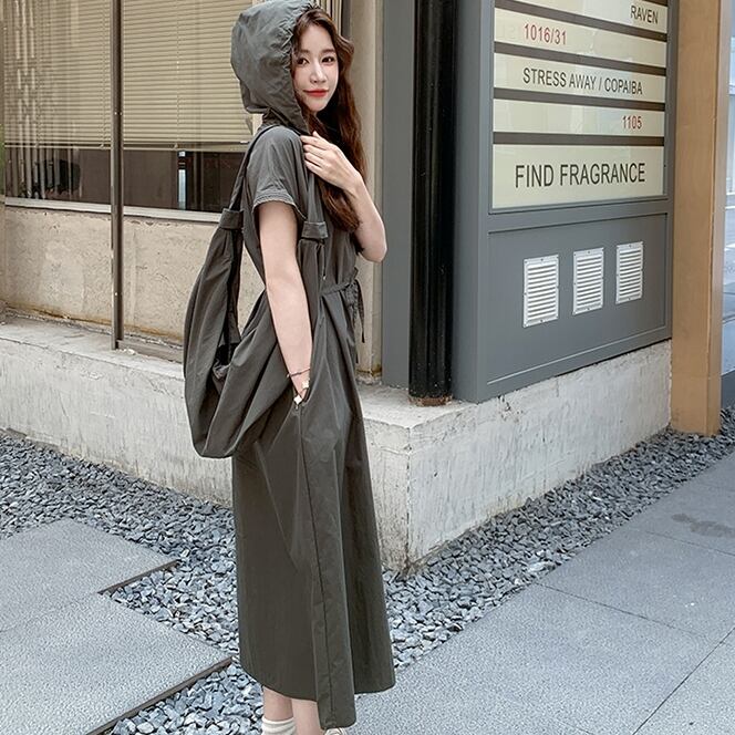 半袖のVネックデザインとフード付きのカジュアルさが魅力的で、ウエストベルトでシルエットを美しく引き締めます。