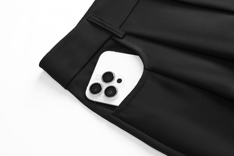 ポケット付きで実用性もあり、フロントのボタンとファスナーが上品さを引き立てます。