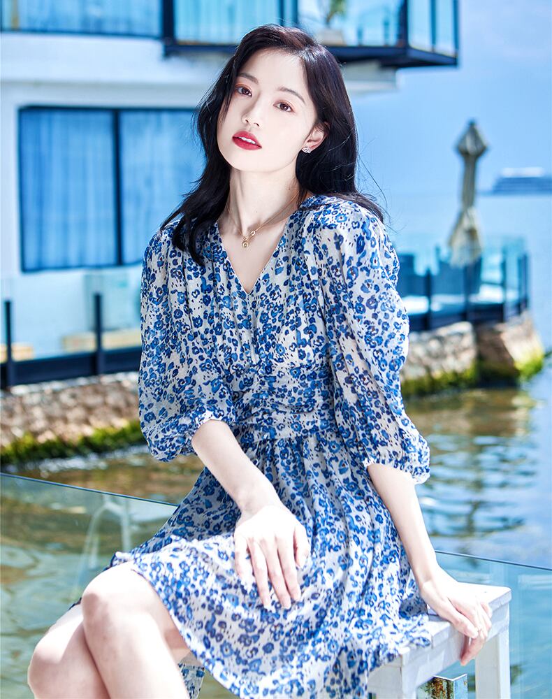 5分袖とVネックデザインが、女性らしいデコルテを美しく引き立てます。