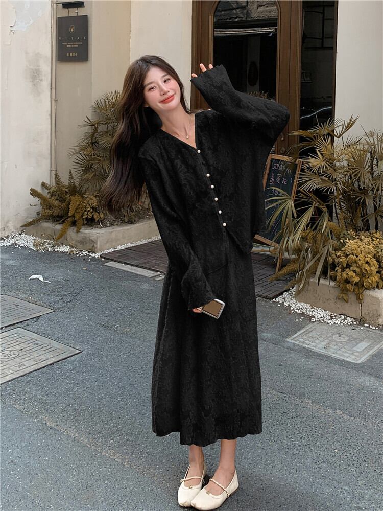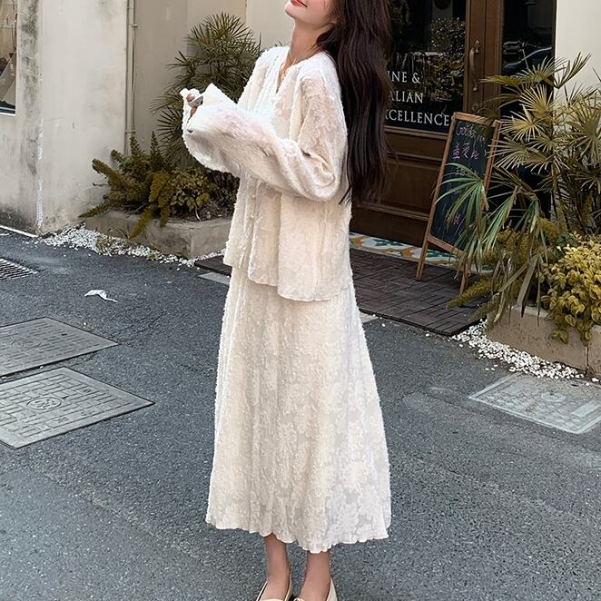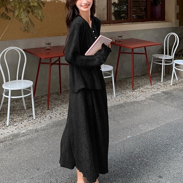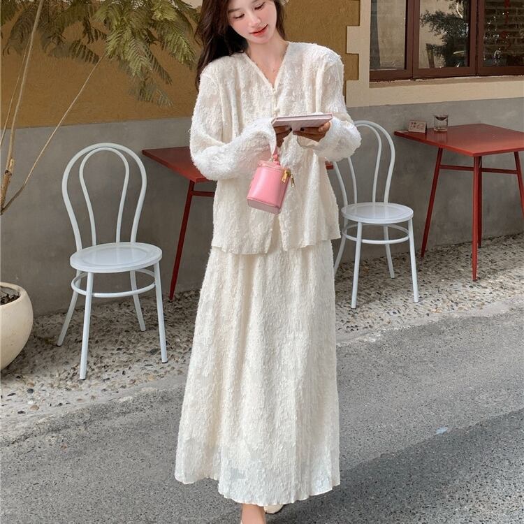 2点セット セットアップ 上下セット シャツ 長袖 Vネック 前開き ボタン ミディアム丈 ロングスカート フレア ハイウエスト 刺繡 かわいい 可愛い 大人可愛い きれいめ シンプル 上品 レトロ おしゃれ かっこいい カジュアル こなれ感 個性的 主役級 存在感 抜け感 春 夏 ベーシック ナチュラル フェミニン 清楚 女性用 レディース ママ OL 通勤 学生 通学 デート お出かけ お泊まり 女子会 旅行 休日 アウトドア カフェ ショッピング コンパ 普段使い デイリー 着回し S M L XL | SPARKJOY レディースファッション