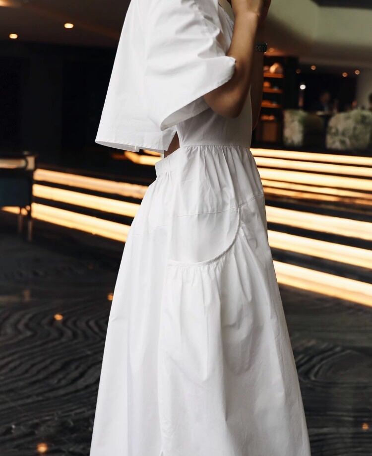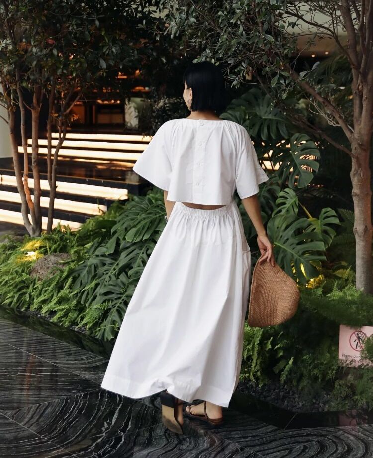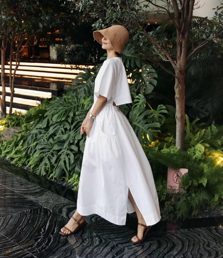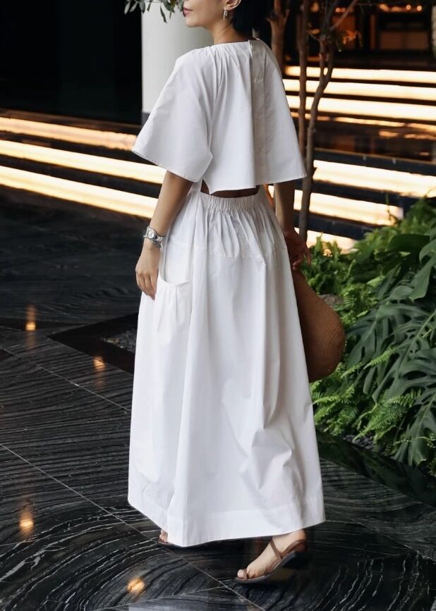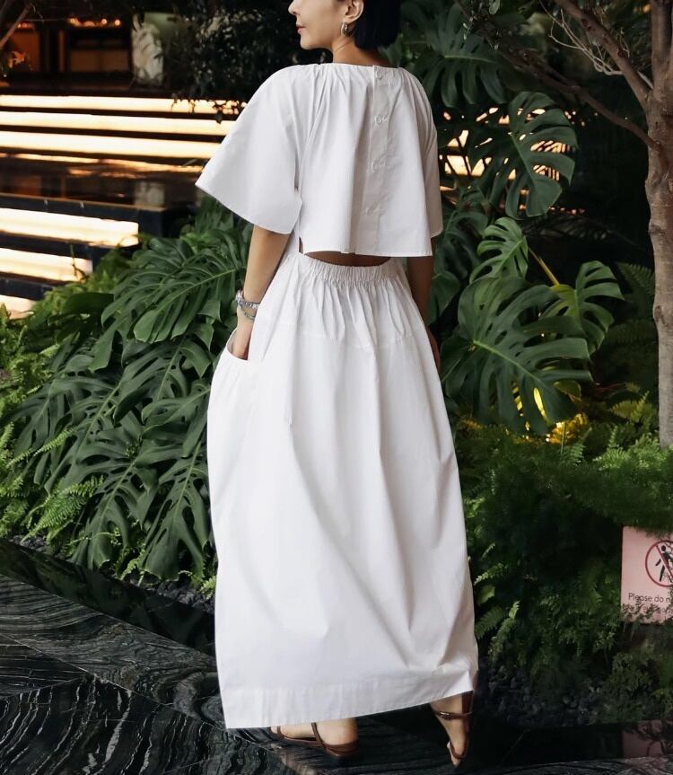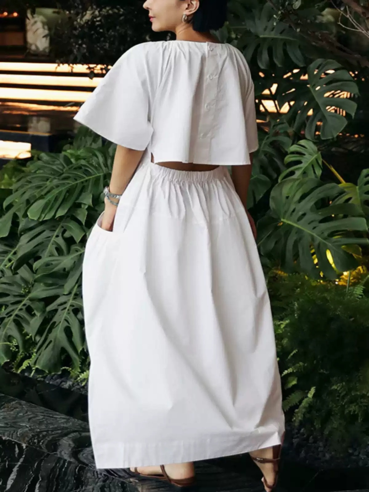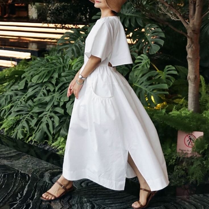 カットアウト レディース ワンピース ミモレ ロング 5分袖 クルーネック セミフレア オーバーサイズ バックコンシャス ウエストゴム かわいい 大人可愛い きれいめ シンプル カジュアル 上品 おしゃれ こなれ感 キュート 都会的 抜け感 ナチュラル 無地 春 夏 デート お出かけ イベント リゾート 旅行 レストラン 女子会 休日 バカンス ホテル ガーデン ショッピング コンパ カフェ 韓国 オルチャン コーデ 普段使い モテ 清楚 トレンド 流行 インスタ映え 定番 S M L XL 白 ホワイト | SPARKJOY レディースファッション
