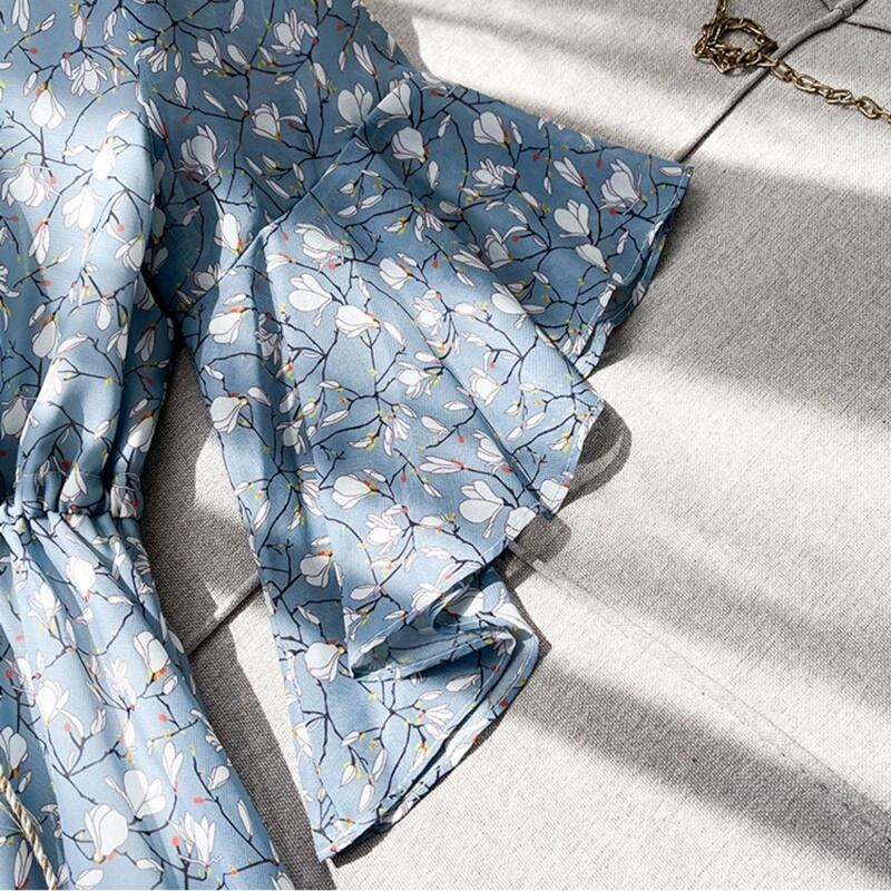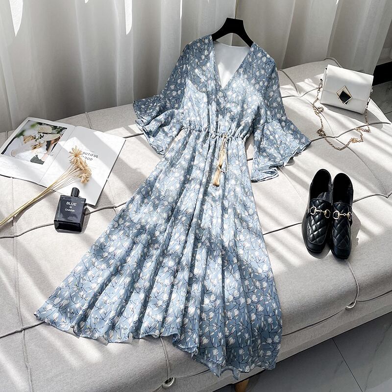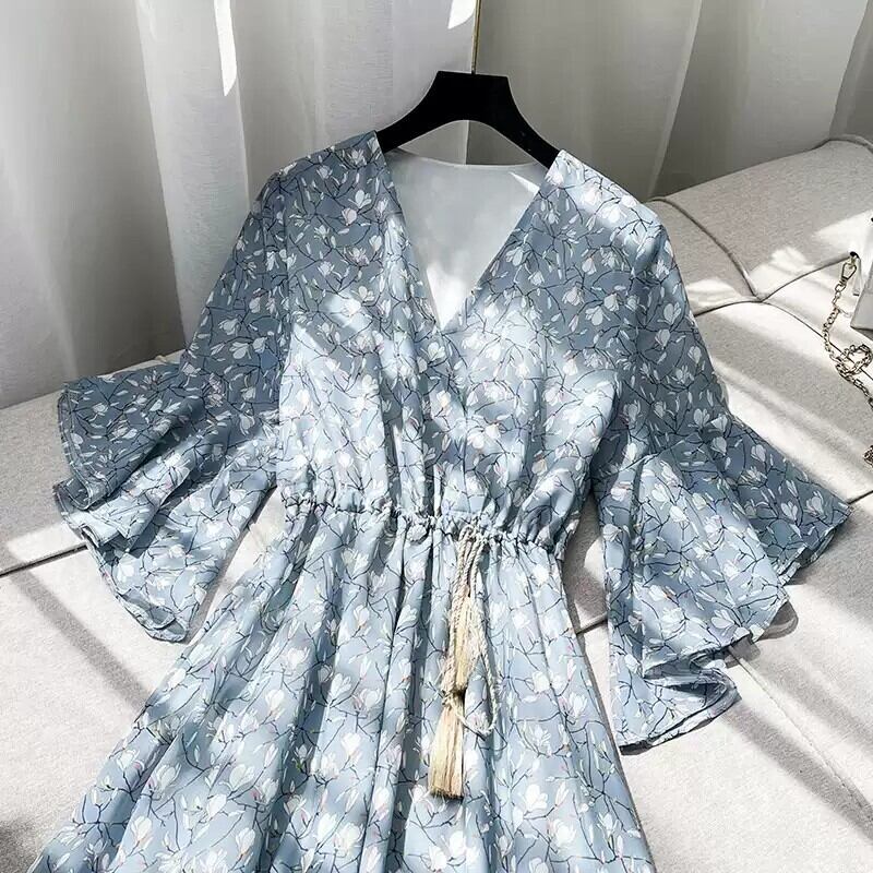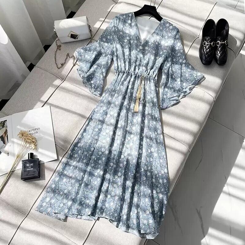 シフォンワンピース 花柄 フレア Vネック レディース ワンピース ロング 7分袖 フレアスリーブ フェミニン ウエストマーク ウエストリボン かわいい 大人可愛い きれいめ 上品 おしゃれ こなれ感 ラブリー キュート ベーシック ナチュラル OL デート お出かけ パーティー イベント 旅行 レストラン 女子会 休日 ホテル ガーデン ショッピング 韓国 オルチャン 楽ちん 体型カバー 美脚 脚長 普段使い 着回し モテ 清楚 トレンド 流行 インスタ映え 定番 M L XL 2XL 3XL 4XL | SPARKJOY レディースファッション