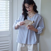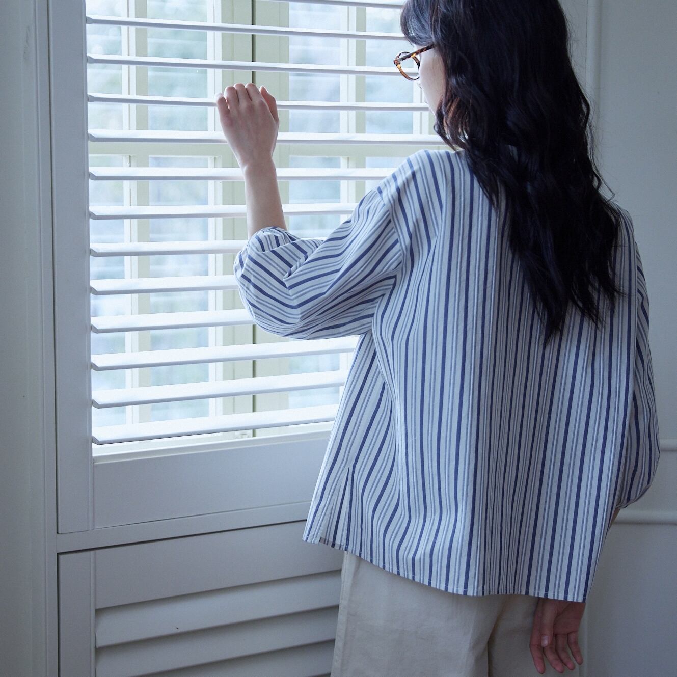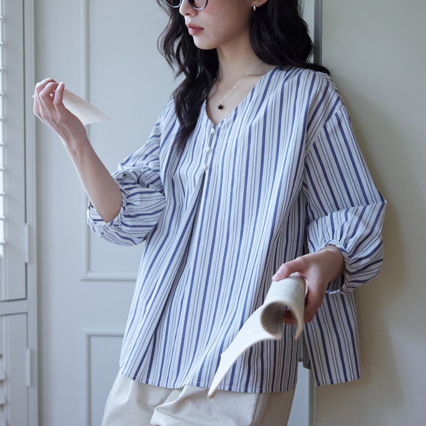 トップス シャツ 7分袖 ボリューム袖 Vネック プルオーバー ショート丈 かわいい 可愛い 大人可愛い きれいめ シンプル 上品 レトロ おしゃれ かっこいい カジュアル レトロ ラフ こなれ感 個性的 主役級 存在感 抜け感 春 夏 ベーシック ナチュラル メンズライク ストライプ柄 女性用 レディース ママ OL 通勤 オフィス 学生 通学 デート お出かけ お泊まり 女子会 旅行 休日 アウトドア カフェ ショッピング コンパ 普段使い デイリー 着回し 重ね着 S M L トレンド モテ | SPARKJOY レディースファッション