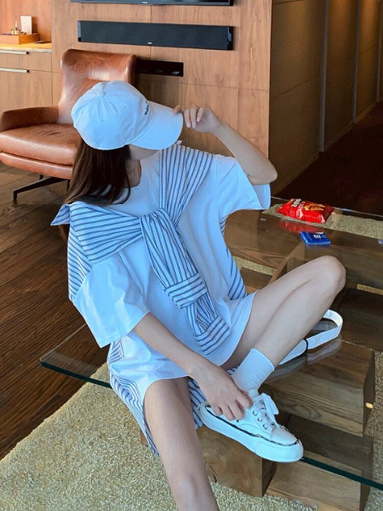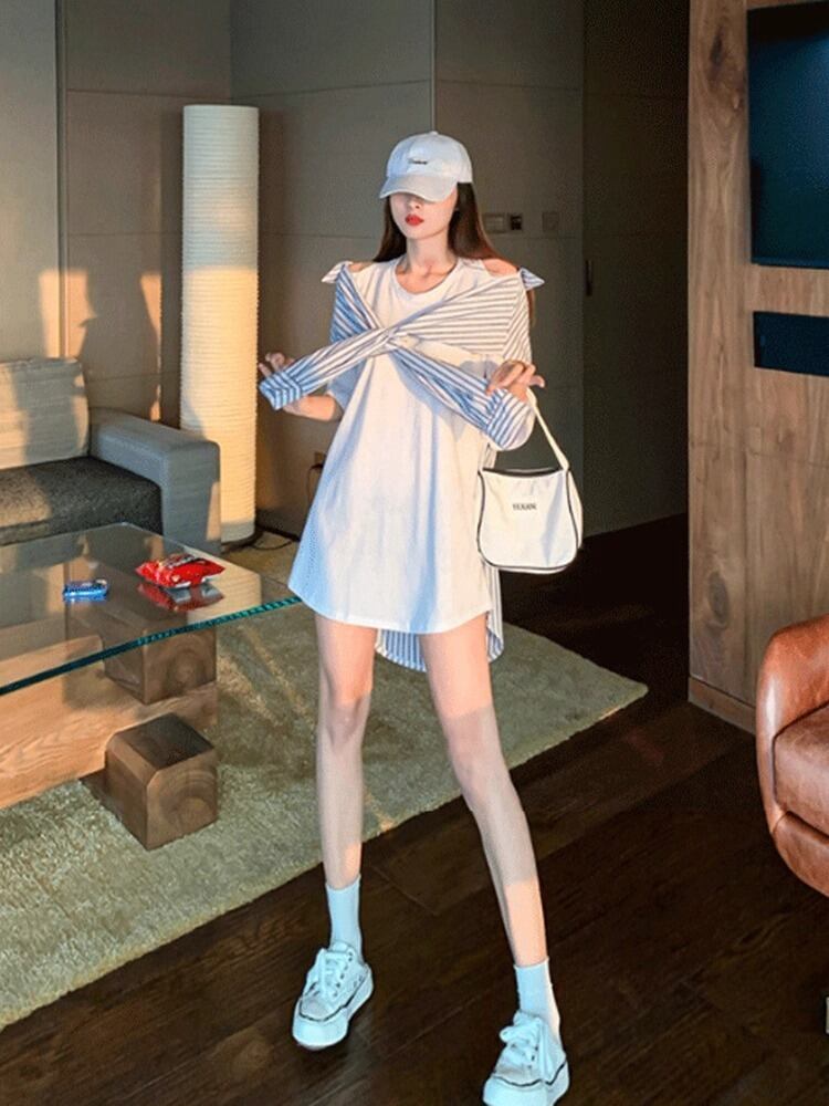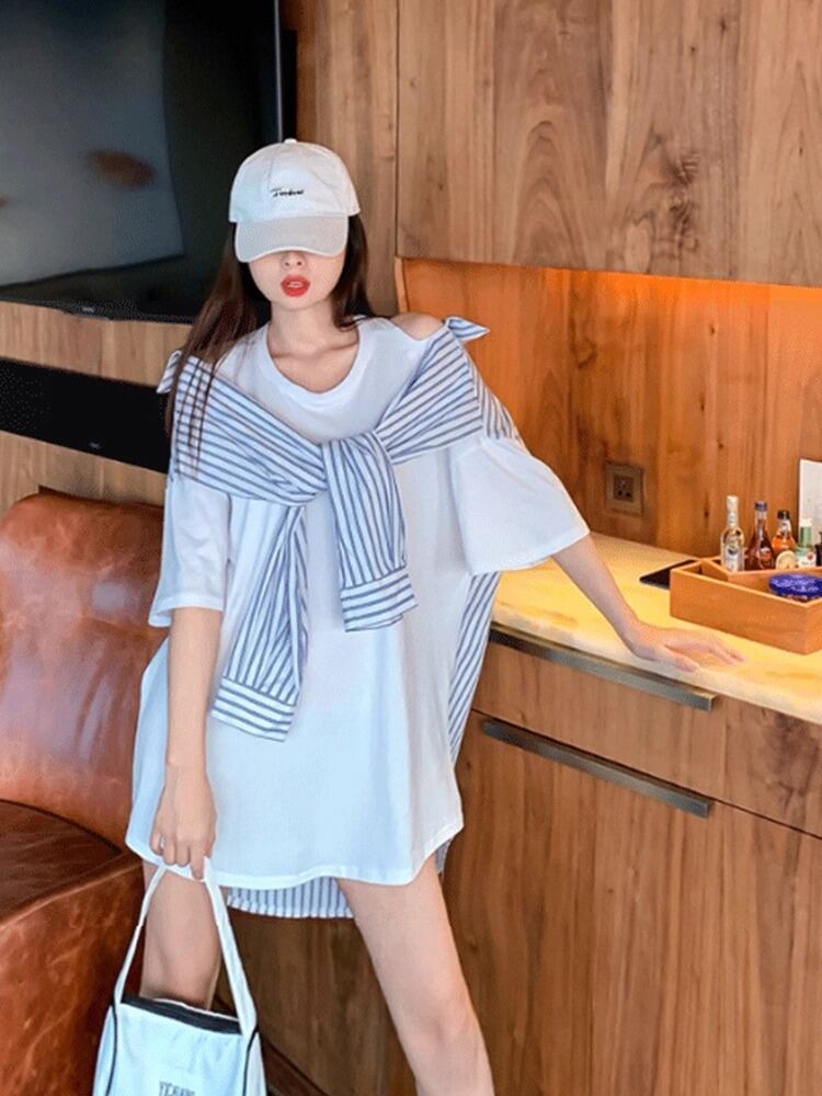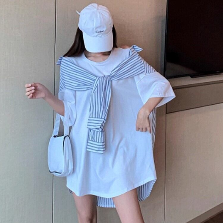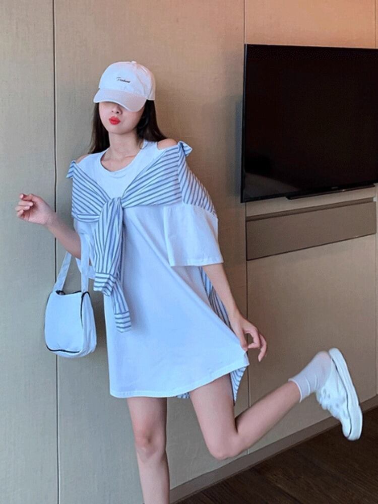 フェイクツーピース レディース トップス 半袖 ラウンドネック オフショルダー ワイド かわいい 大人可愛い きれいめ シンプル カジュアル 上品 おしゃれ かっこいい レトロ エキゾチック こなれ感 ラフ メンズライク マニッシュ ボーイッシュ スポーティー 個性的 クール 抜け感 ベーシック アクティブ 無地 ストライプ 春 夏 デート お出かけ 旅行 公園 休日 ショッピング コーデ 楽ちん 体型カバー 普段使い モテ S M L XL ビッグ ゆったり ゆる ホワイト ベーシックカラー 大人カラー | SPARKJOY レディースファッション